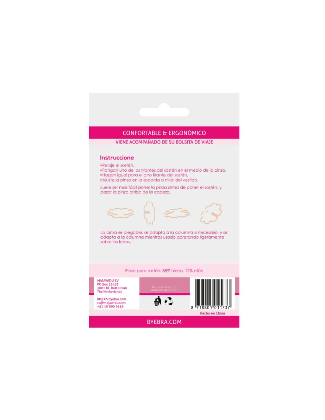 Introducing a new generation of bra clips, Bye Bra takes traditional accessories to another level. The Bye Bra clamp is ergonomic and foldable. It can be stretched and folded to fit the shape of your back if necessary. Hiding bra straps will be much easier and more comfortable as the Bye Bra clip adapts to the user's morphology and is almost not felt. Each box contains four tweezers, each a different color.