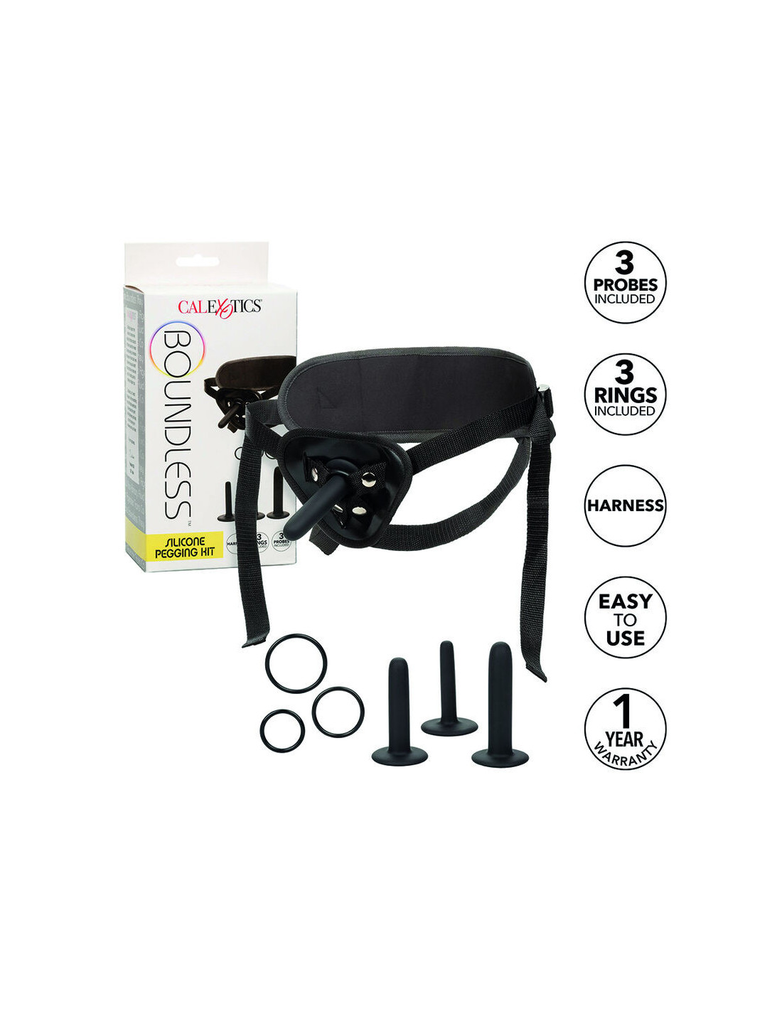 TheBoundlesssilicone peg kit is available for purchase. Made to immerse you in the exciting world of infinitely satisfying pleasure. This anal pleasure set is Made to play with 3 graduated sizes of pegging probes, a universal harness, and 3 graduated sizes of support rings. The sensual silicone probes are made to increase pleasure with 3 graduated sizes to make it easier for you to excite your backdoor passions. Easily change probe size with the set of 3 interchangeable harness rings to accommodate any dong, dildo or Boundless harness toy. Stay comfortable during even the most vigorous pleasure play with the universal fit, fully adjustable thigh and waist straps, and supportive back band. Embrace uninhibited play, unbridled pleasure and let your fantasies fly with this harness and probe set.