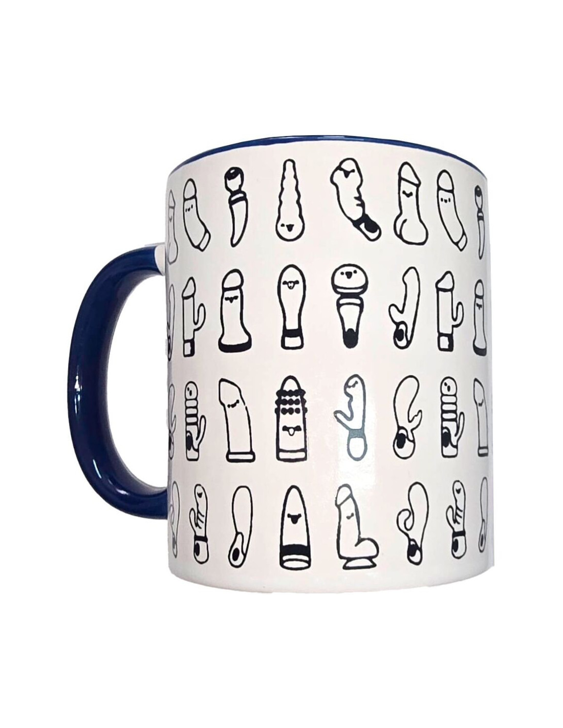Made of high-quality ceramic, this mug features a glossy white finish on the outside, decorated with fun erotic vibrator-inspired drawings. Its deep blue handle and interior add an elegant and contrasting touch, ideal for those who enjoy details with personality.