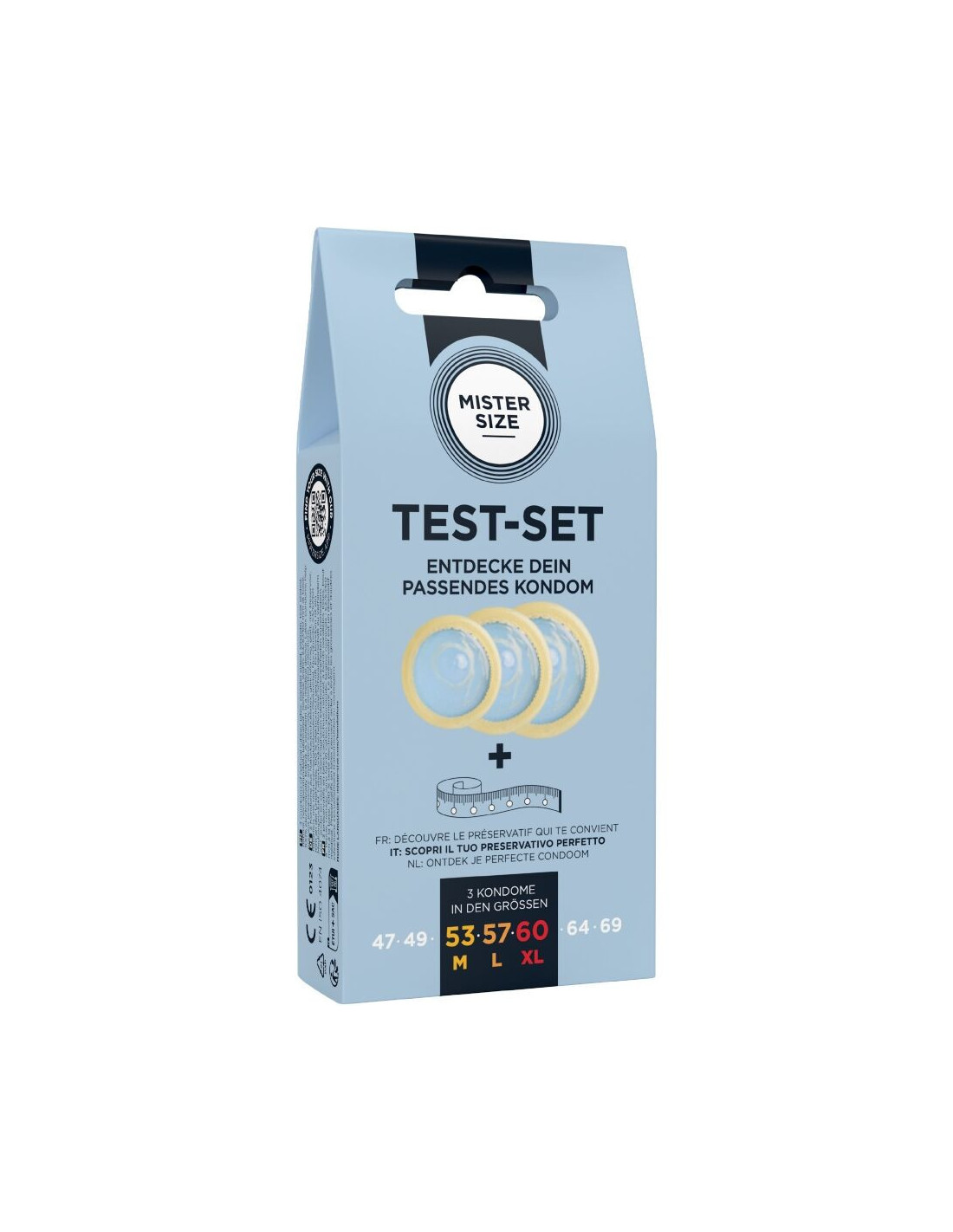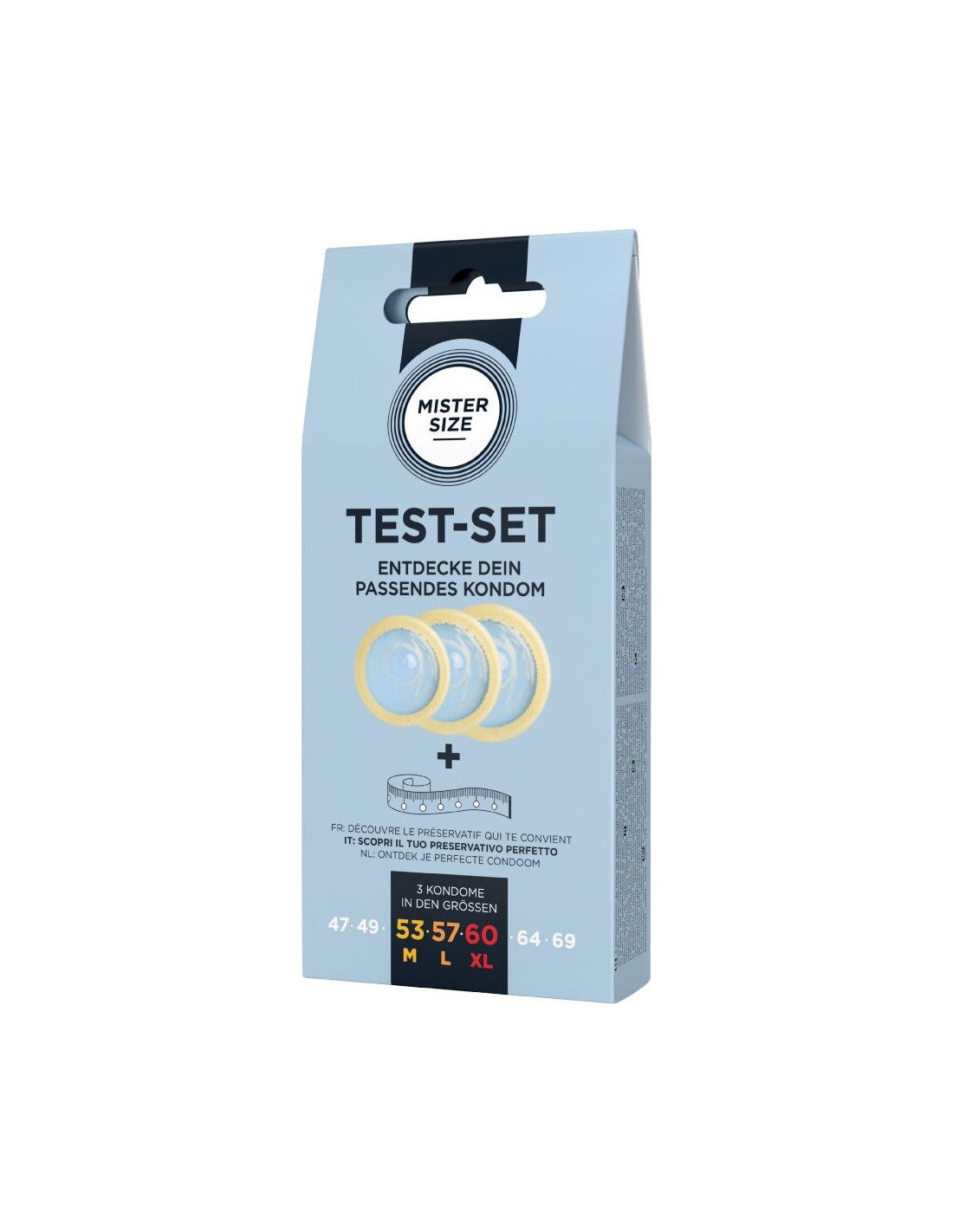 Find your size with the size test kit. The MISTER SIZE test kit, with measuring tape and medium trial pack, helps you discover your ideal condom size. The sizes 53 mm, 57 mm, and 60 mm included in the kit cover the most common ones. If you use a different size, you can check it with the measuring tape and feel the difference with the medium trial pack.