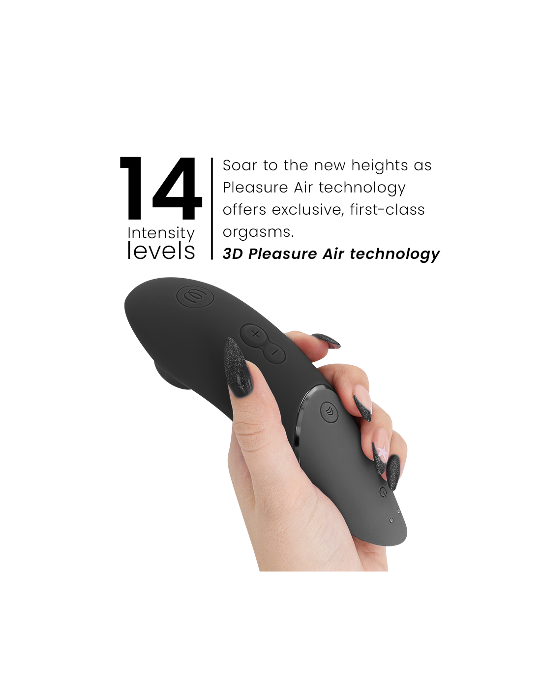 Like other Womanizer models, the 3D Pleasure Air waves never touch the skin; they feel like a gentle combination of suction and soft pulsations. The stimulation is often described as more refined and immersive, leading to more intense and fulfilling orgasms. The sensation is deep and envelops the entire clitoris, not just the surface. With 14 intensity levels and 3 Climax Control levels, you are in full control—whether you desire soft, teasing waves or orgasms that build gradually.