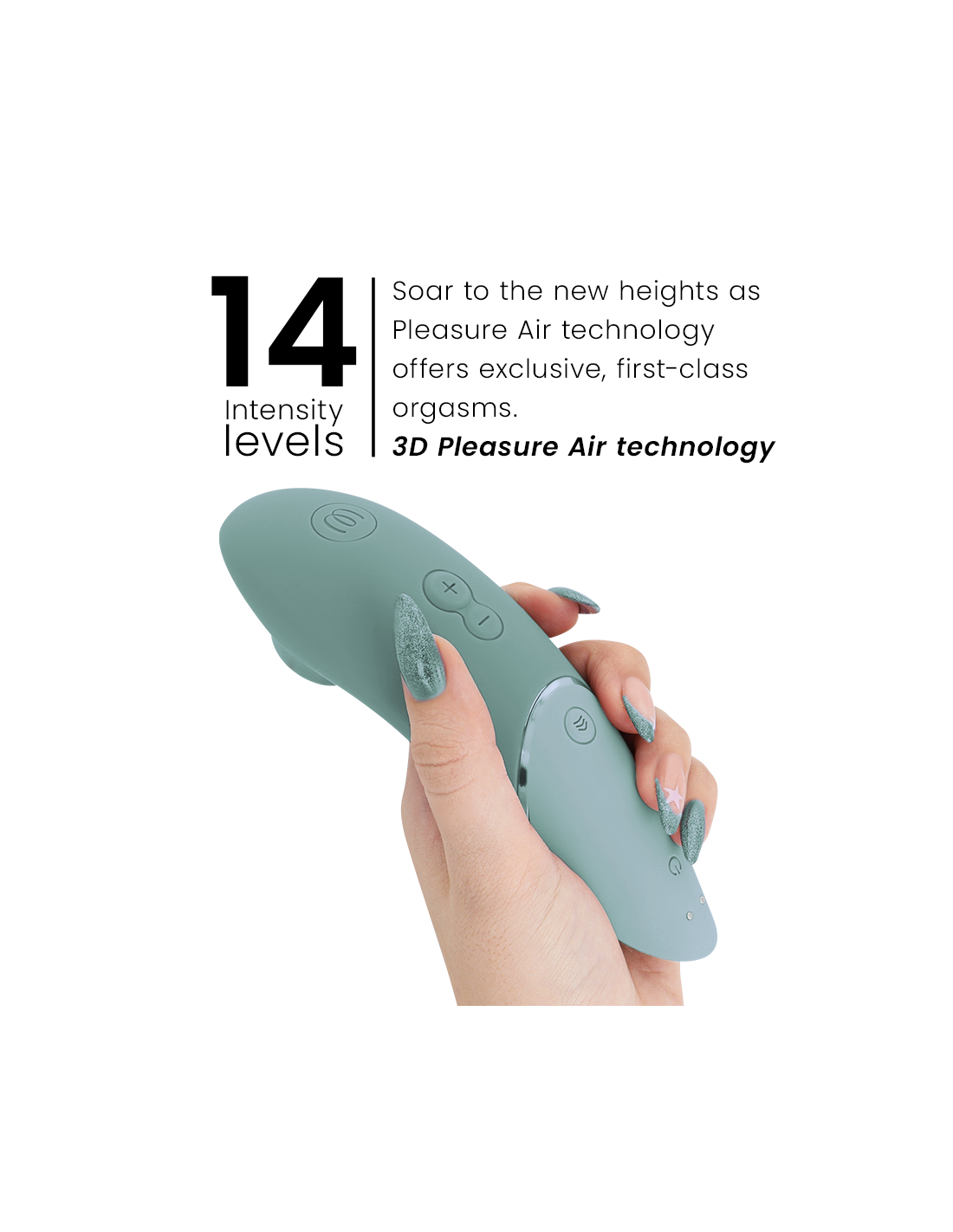 Like other Womanizer models, the 3D Pleasure Air waves never touch the skin; they feel like a gentle combination of suction and soft pulsations. The stimulation is often described as more refined and immersive, leading to more intense and fulfilling orgasms. The sensation is deep and envelops the entire clitoris, not just the surface. With 14 intensity levels and 3 Climax Control levels, you are in full control—whether you desire soft, teasing waves or orgasms that build gradually.