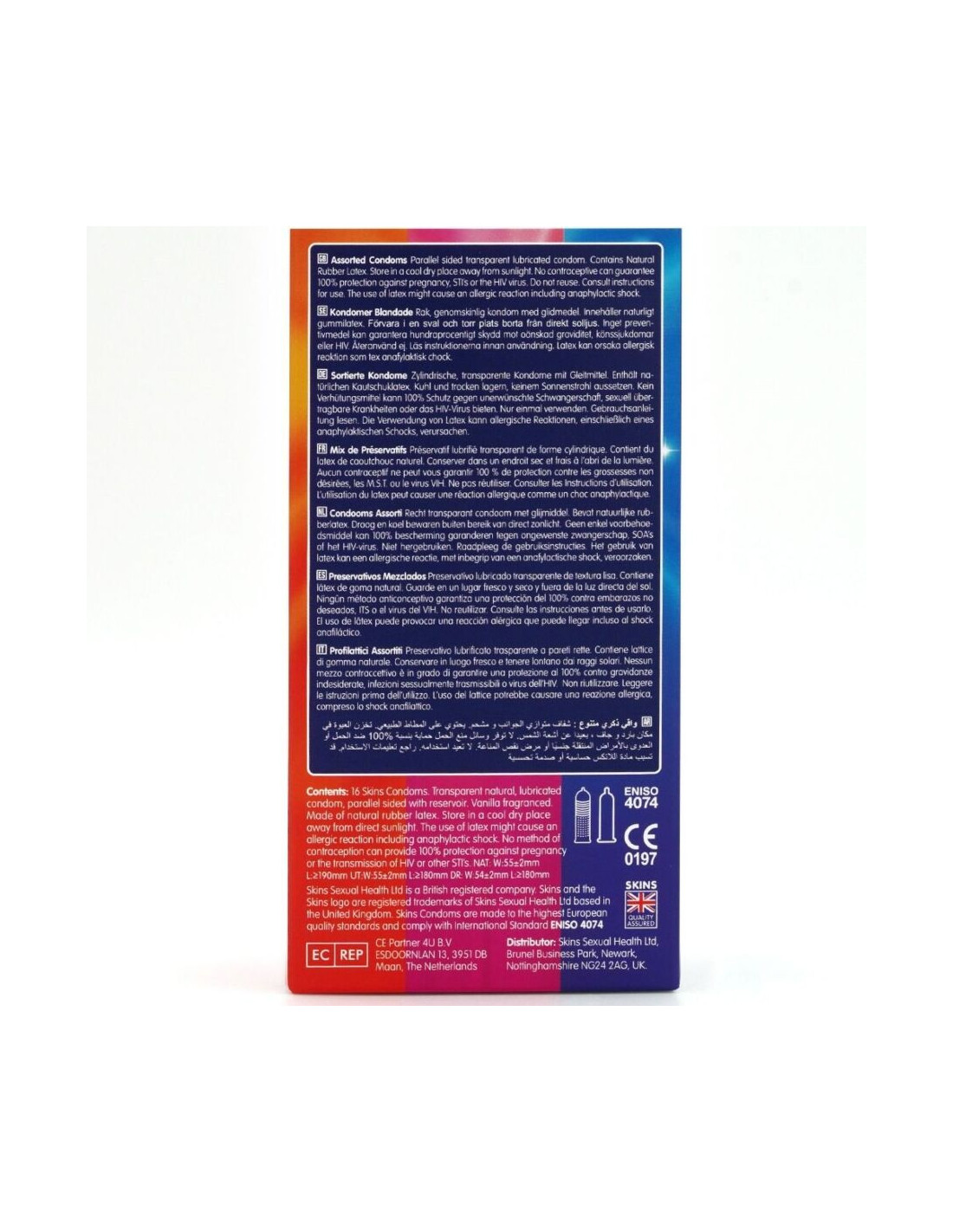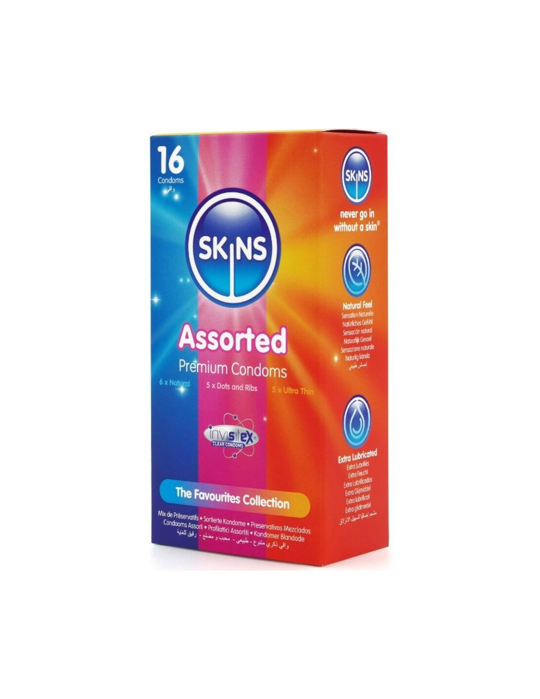 Add variety to your sex life and stay protected with Skins Assorted Condoms. 16 individual condoms in 3 exciting varieties. Each pack contains a mix of natural, dotted, ridged, and ultra-thin condoms, allowing you to enjoy different pleasure adventures with this assortment pack of Skins favorites.