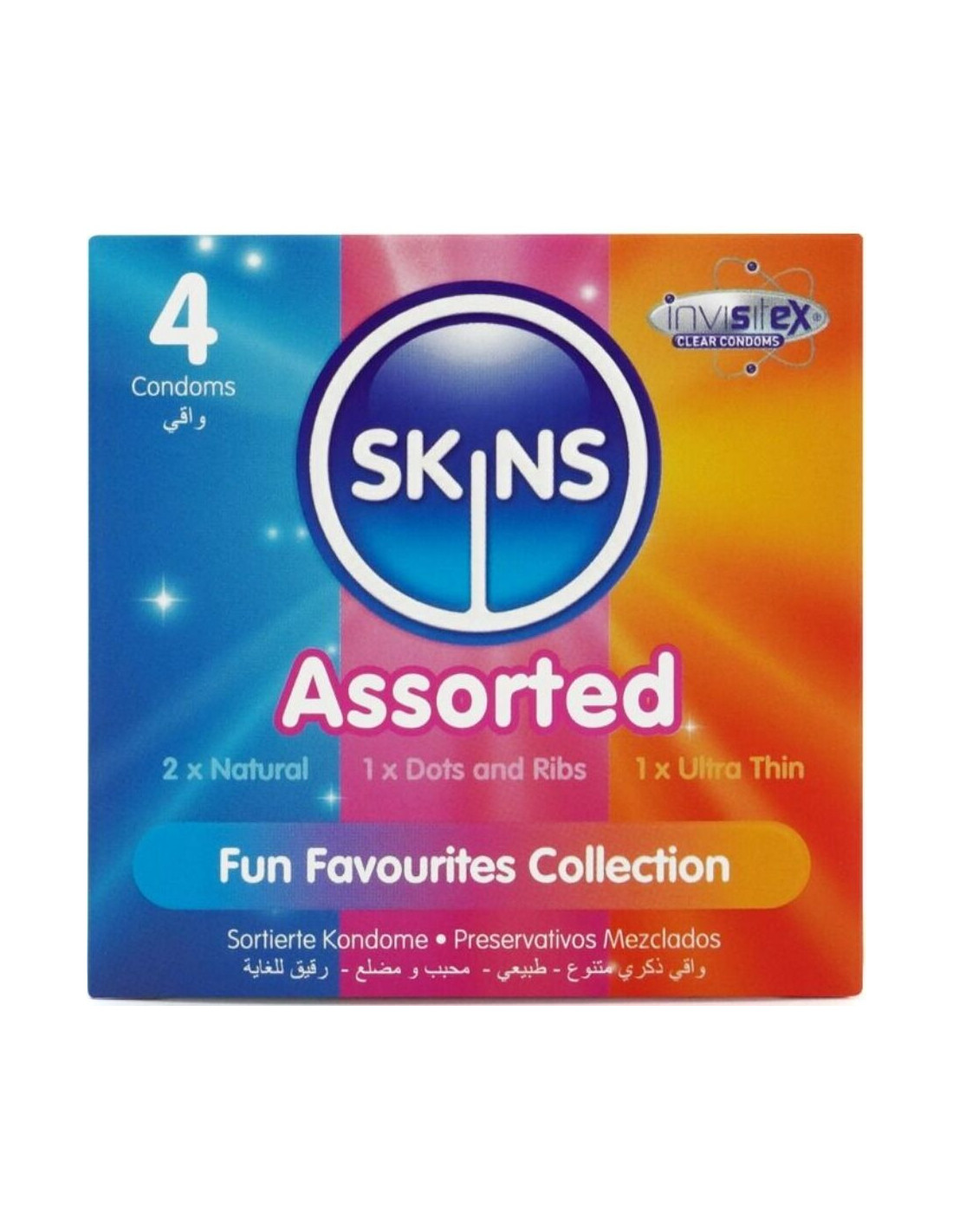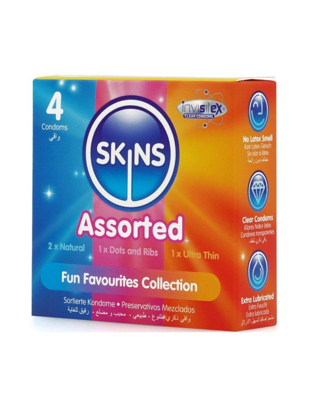 Add variety to your sex life and stay protected with Skins assorted condoms. 4 individual condoms in 3 exciting varieties. Each pack contains a mix of natural, dotted, ribbed, and ultra-thin condoms, allowing you to enjoy different pleasure adventures with this assorted pack of Skins favorites.