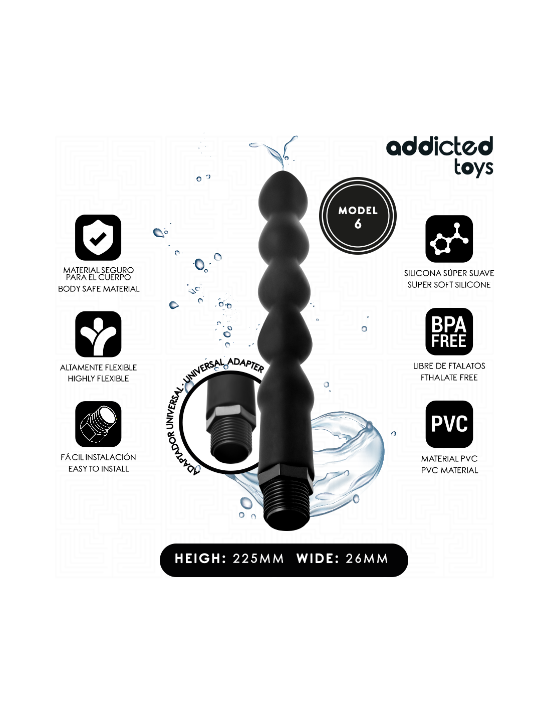 Explore without limits with the right preparation. Intimate hygiene is key to enjoying your anal experiences to the fullest, and with the Addicted Toys anal cleaner, you'll get a deep, safe, and hassle-free clean. This Model 6, part of a range of 6 different designs, is designed to be comfortable, soft, and effective as part of your daily or pre-play intimate routine. Made with premium materials like flexible PVC and super-soft silicone, this accessory is completely body-safe and phthalate-free, meeting high hygiene standards. Thanks to its universal adapter, it is compatible with most shower systems, making it easy to install in seconds and ensuring practical, hassle-free use.