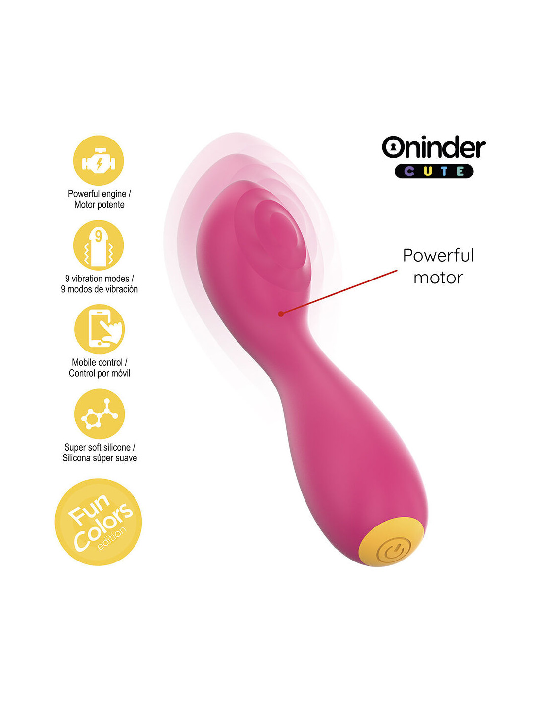 Experience innovative stimulation with the ONINDER CUTE collection vibrator, designed for those seeking power, technology, and a vibrant design. With its elegant combination of dark pink and yellow base, this compact vibrator incorporates advanced Tapping technology, offering you unique and deep sensations.