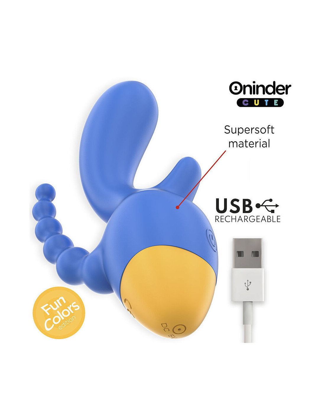 Explore a world of sensations with the ONINDER CUTE collection vibrator, designed for those seeking complete and precise stimulation. With its vibrant combination of dark blue and yellow base, this vibrator offers dual stimulation, providing pleasure to both the clitoris and anal area, in an ergonomic and comfortable design.