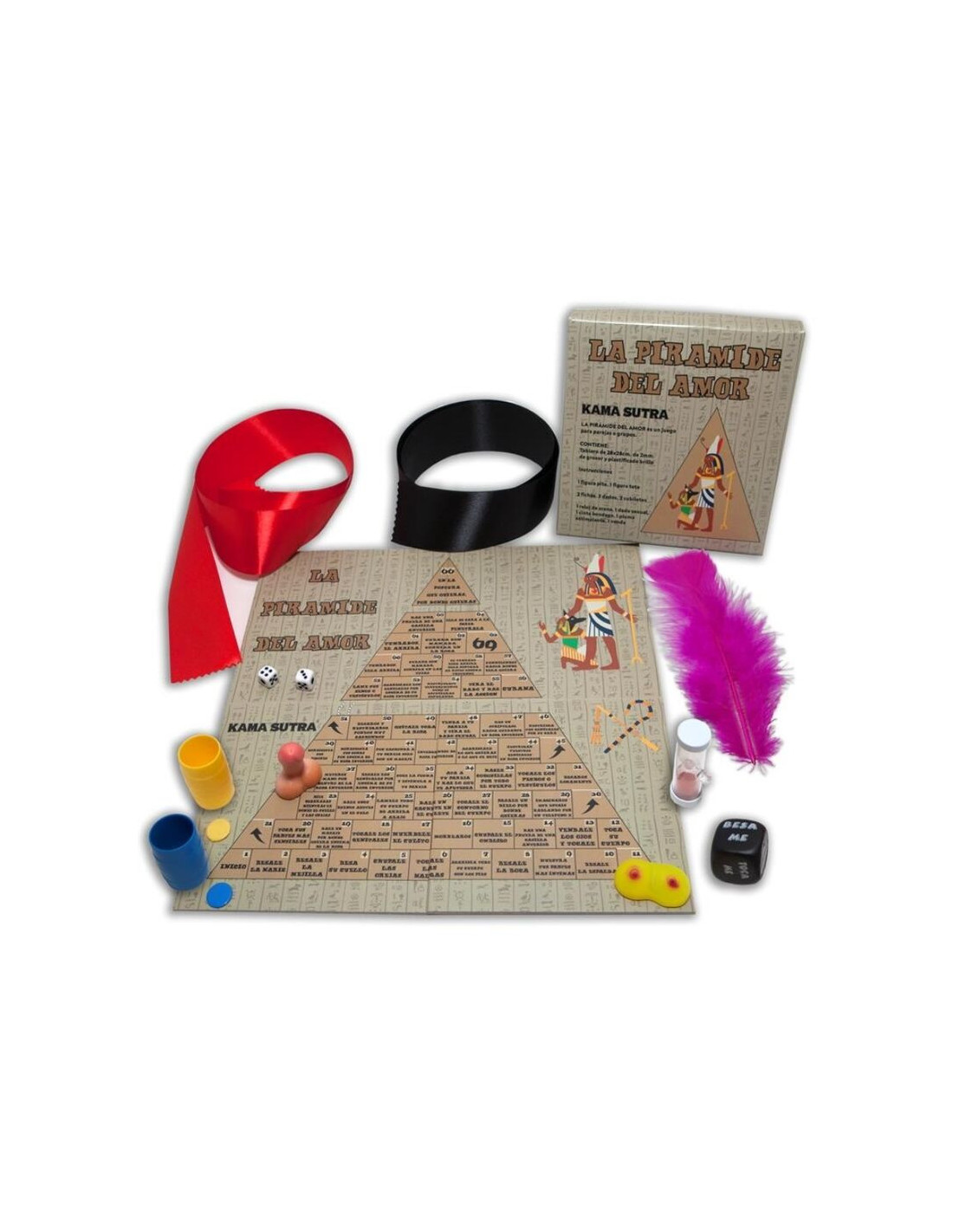 IT CONTAINS: INSTRUTIONS, BONDAGE TAPE, EYE BAND, STIMULATING PEN, A HIGH-QUALITY 25mm DICE, HOURGLASS, 1 WHISTLE AND TETA FIGURE, 2 TOKENS, 2 CUPS, 2 NUMERIC DICE AND A FULLY COLORED PLASTIFIED BOARD .