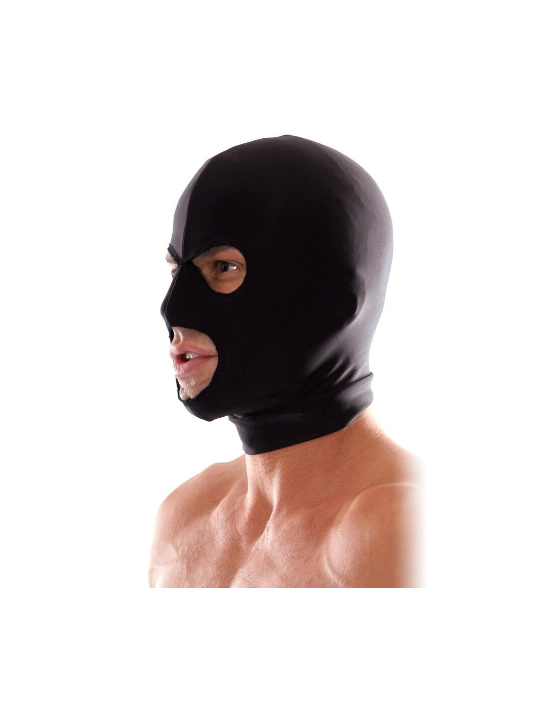Keep your submissive incognito with this Spandex 3-Hole Hood. This comfortable open-mouth and eyes hood is designed to stretch completely over the head, while the thin lightweight fabric makes breathing and hearing a snap.