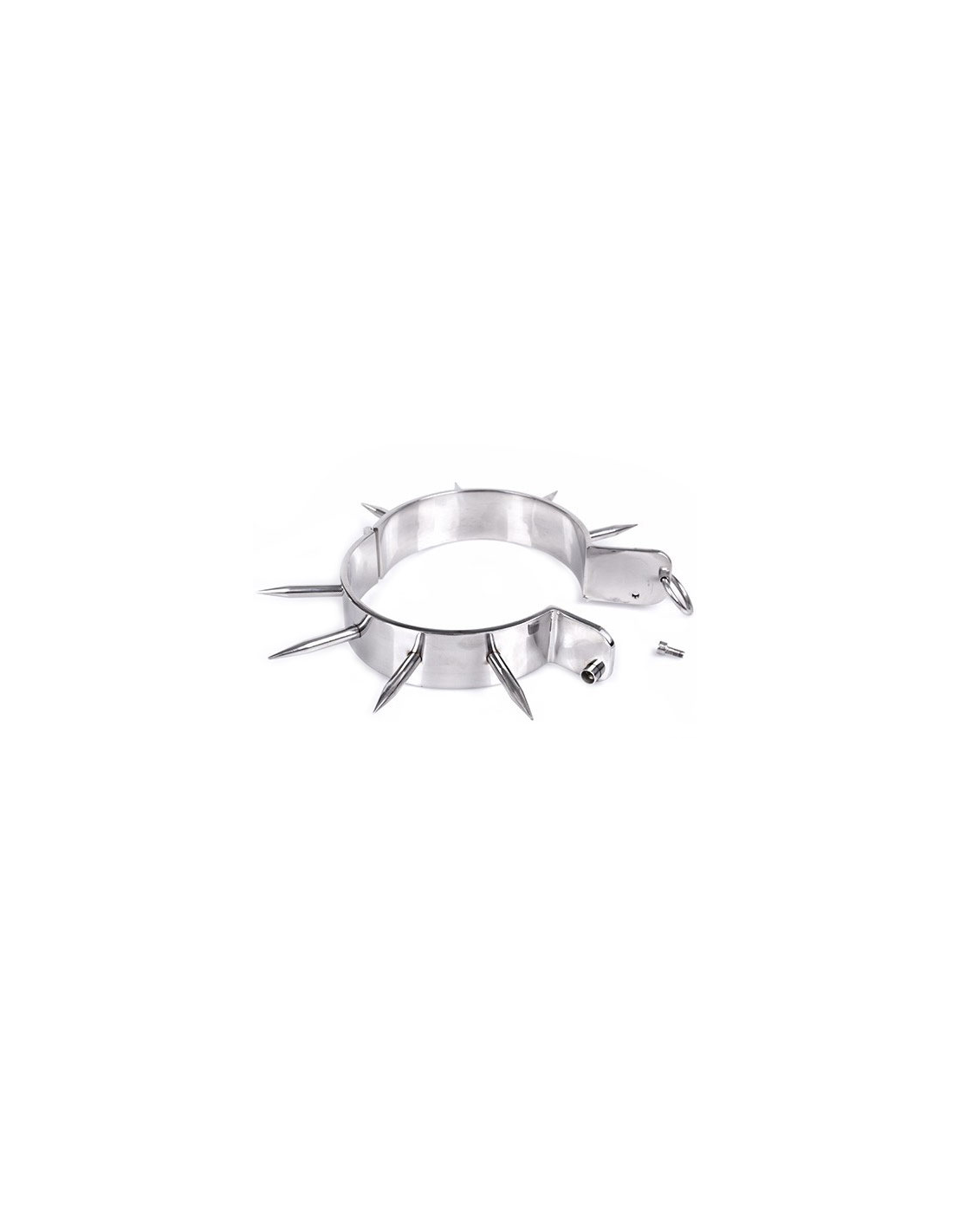 This chrome metal collar locks with an included allen key. It has a shiny finish with pointed tips. The collar has an O-ring to attach a carabiner chain, rope or any other bondage item.