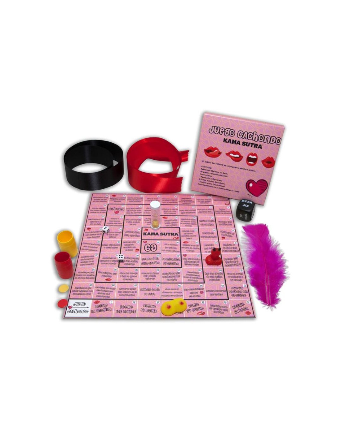 IT CONTAINS: INSTRUTIONS, BONDAGE TAPE, EYE BAND, STIMULATING PEN, A HIGH-QUALITY 25mm DICE, HOURGLASS, 1 WHISTLE AND TETA FIGURE, 2 TOKENS, 2 CUPS, 2 NUMERIC DICE AND A FULLY COLORED PLASTIFIED BOARD .