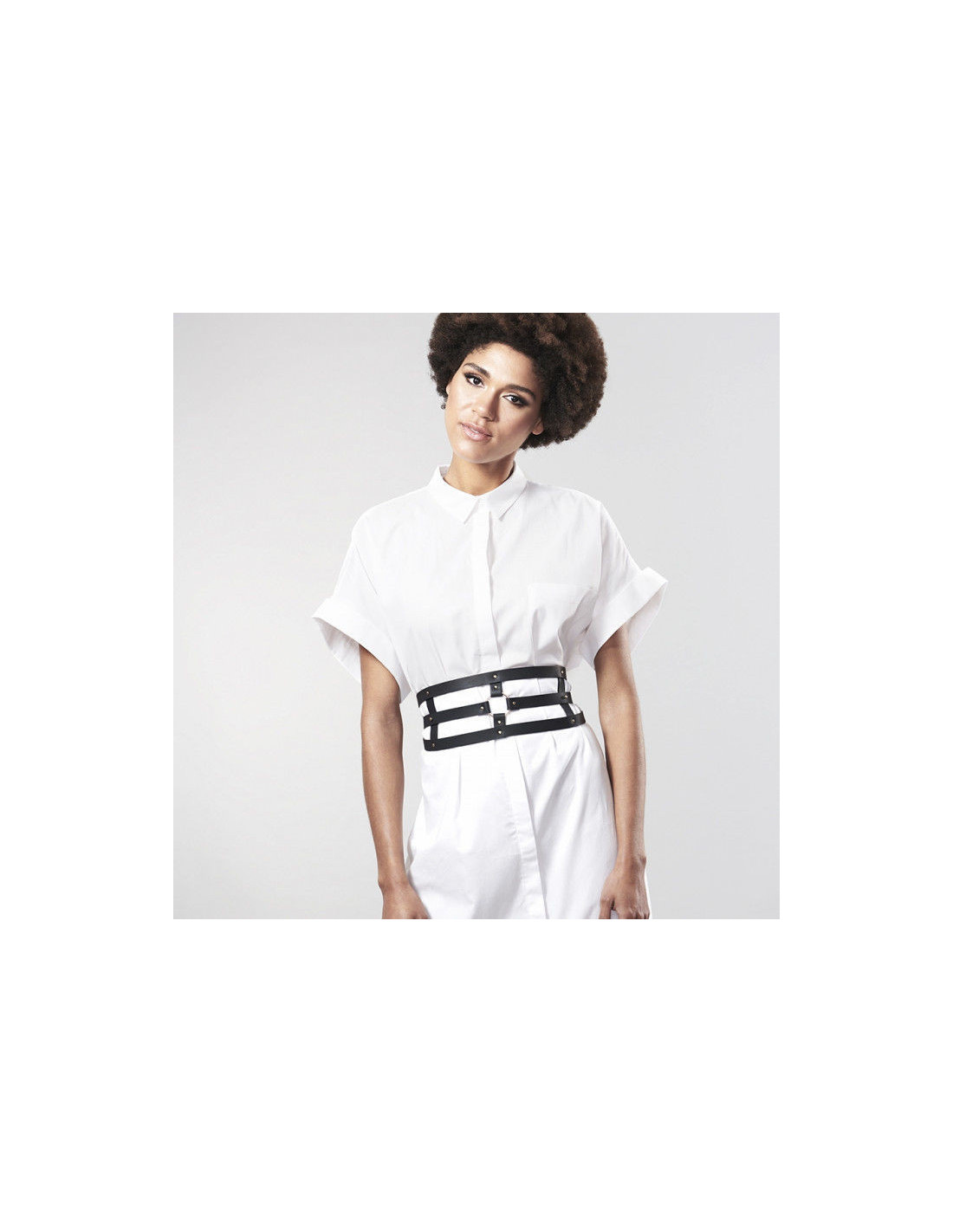 The strap located in the middle of this accessory hides a secret: untie it from your waist to reveal it. Start by releasing this strap from your body, as you see it divides into two; Unhook the extension from the left strap. Continue unclipping at the front of the belt, both left and right ends of the vertical straps.