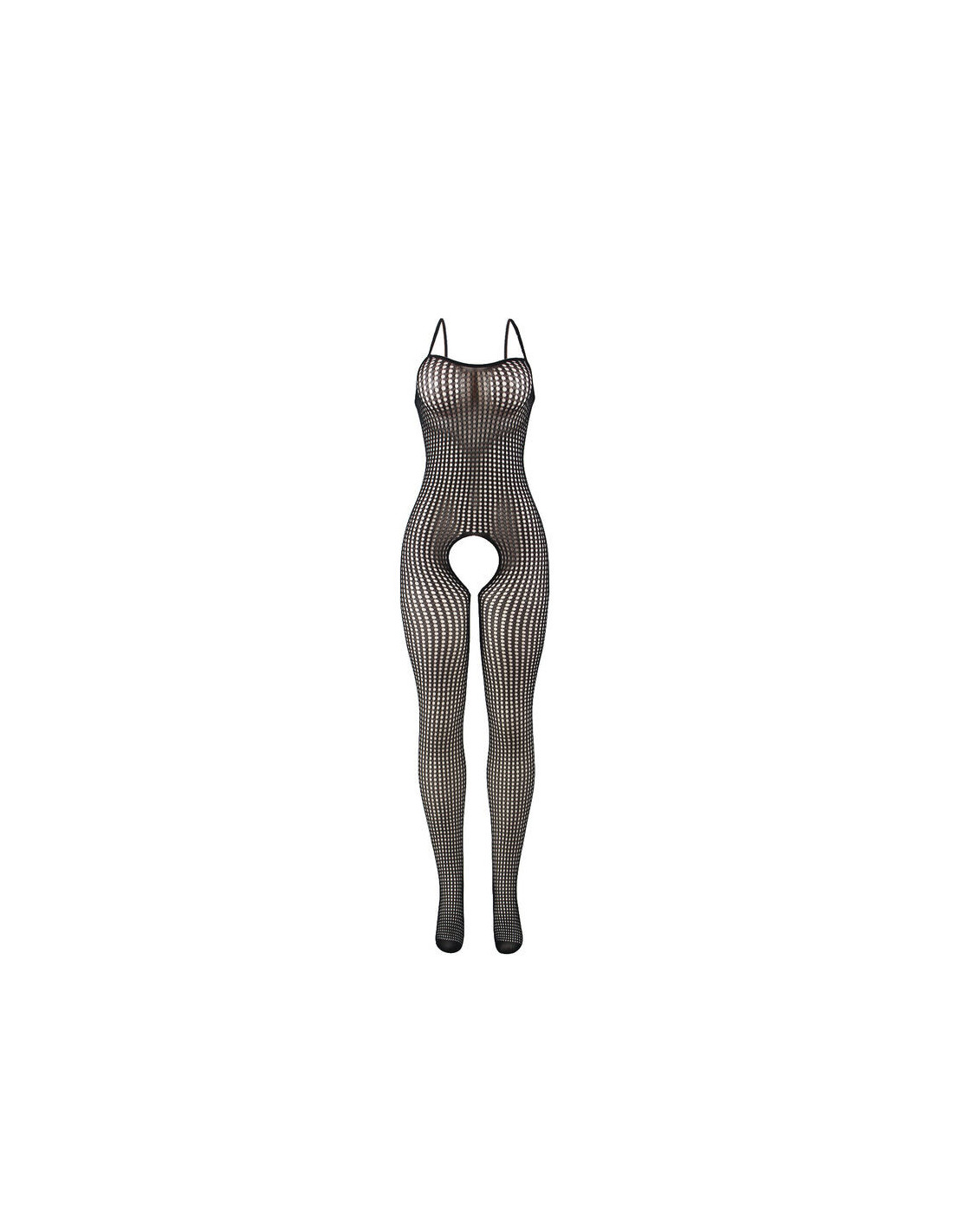 - Style: Black elastic fishnet bodystocking with crotchless design (open crotch).
