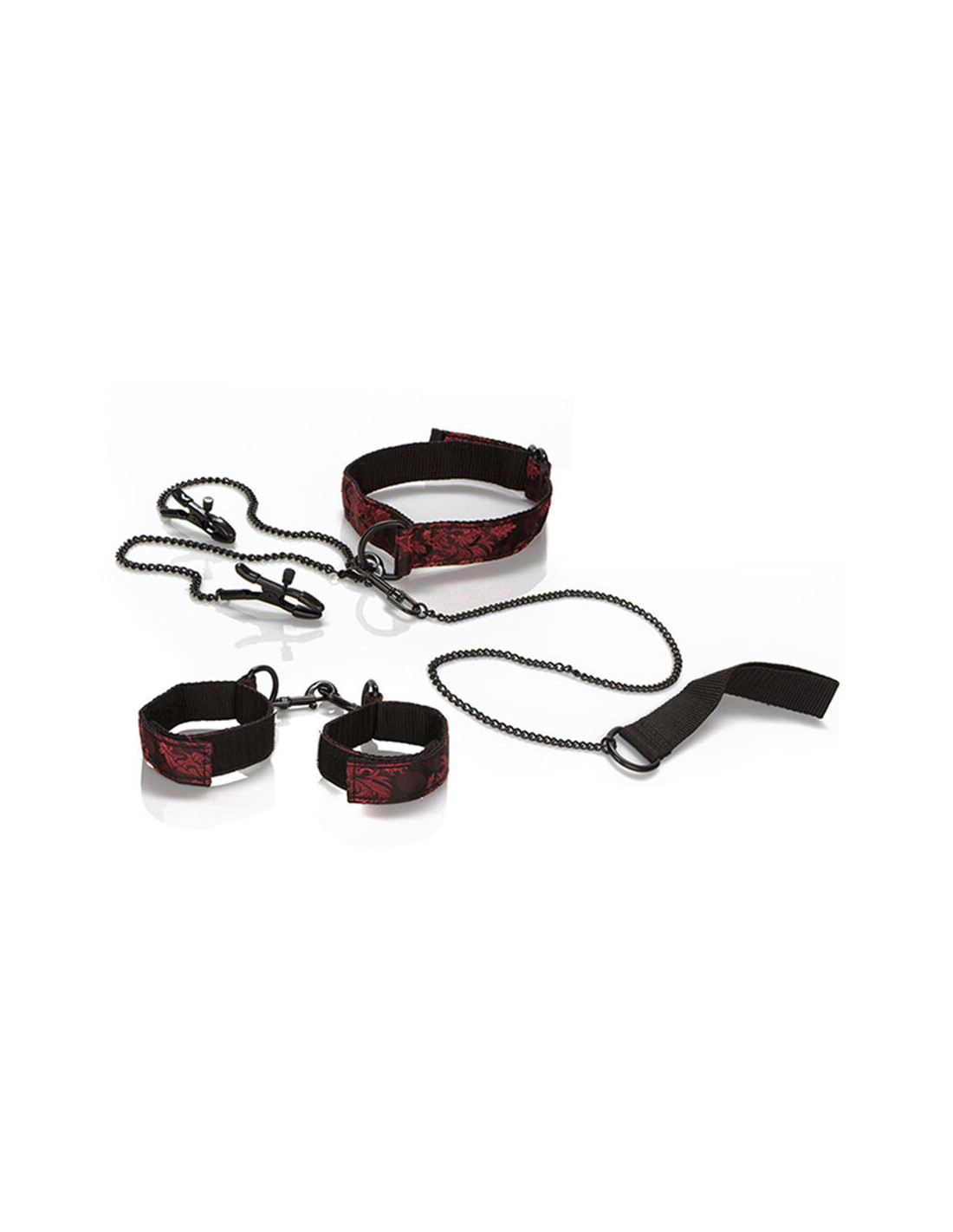 Surrender completely with the Scandal Submissive Kit—a luxurious all-in-one set for exploring control and sensation. It includes adjustable cuffs, a dual-sided collar with leash, a blindfold, and nipple clamps with soft pads for safe stimulation of your most sensitive spots.