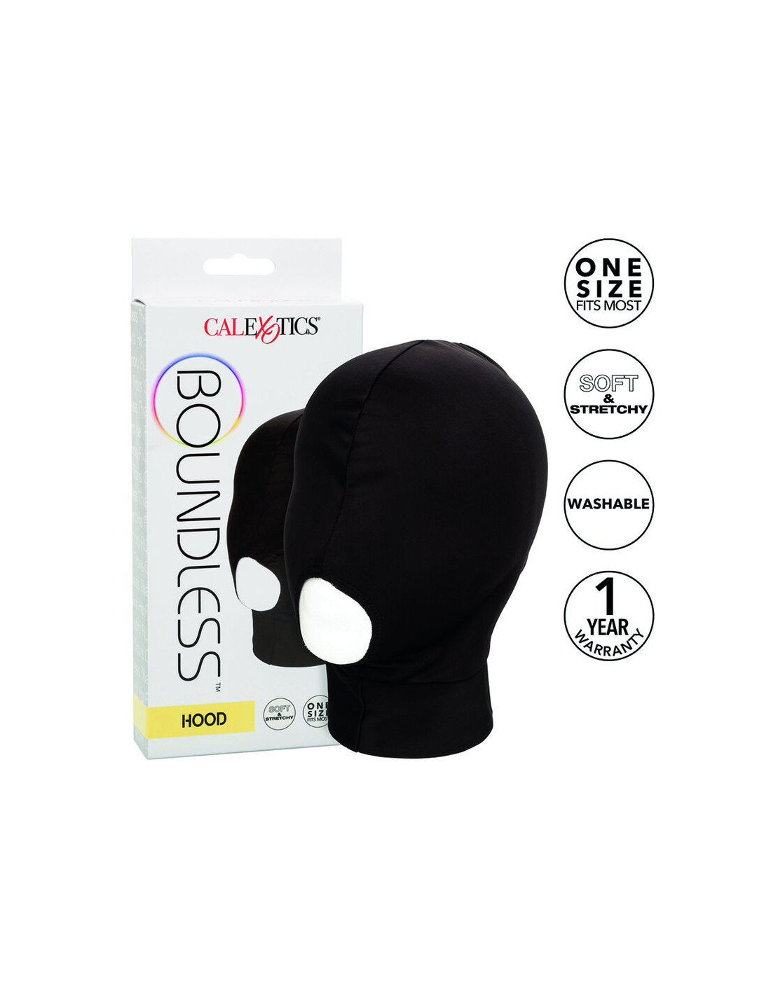 CalExotics Boundless Hood is ideal for couples looking to experiment with sensory pleasure play and immerse themselves in exciting erotic adventures. Expand the limits of your ecstasy with the daring open-mouth hood featuring breathable fabric, a stretchy fit, and a view-restricting design. Surrender to your lovers every whim once you put on this sensory deprivation hood. The luxuriously soft mask creates a vision-restricting sensation that increases sensitivity, heightens pleasure, and intensifies arousal for everyone involved. Give in to primal desires and outrageous pleasure with the sexy open mouth design.