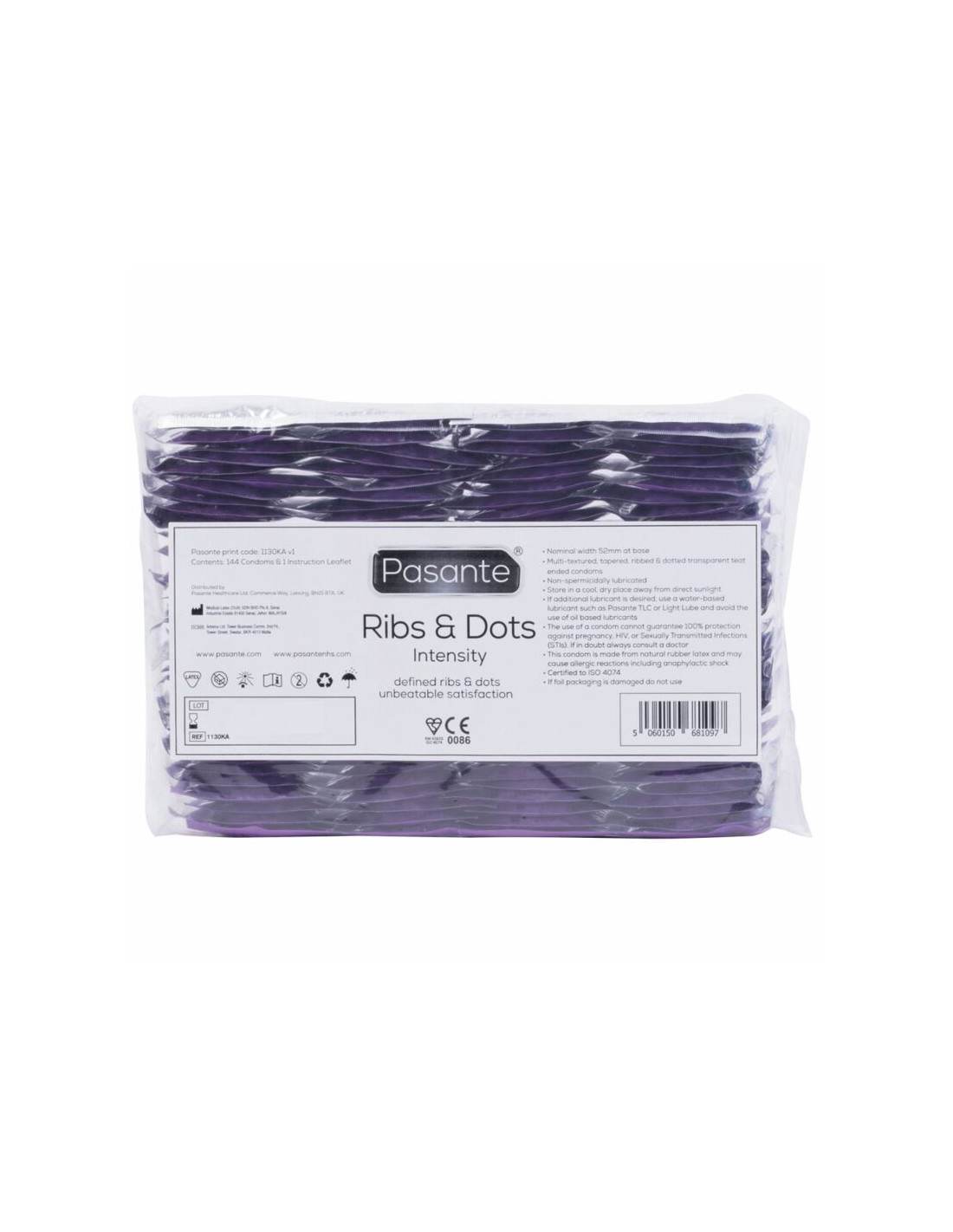 Condoms with a ribbed and dotted texture, for greater satisfaction and greater pleasure for both parties. Pasante Ribs & Dots Intensity condoms are tapered, textured condoms with pronounced grooves and dots for a better feel. They are natural-colored and have a teat-like finish.