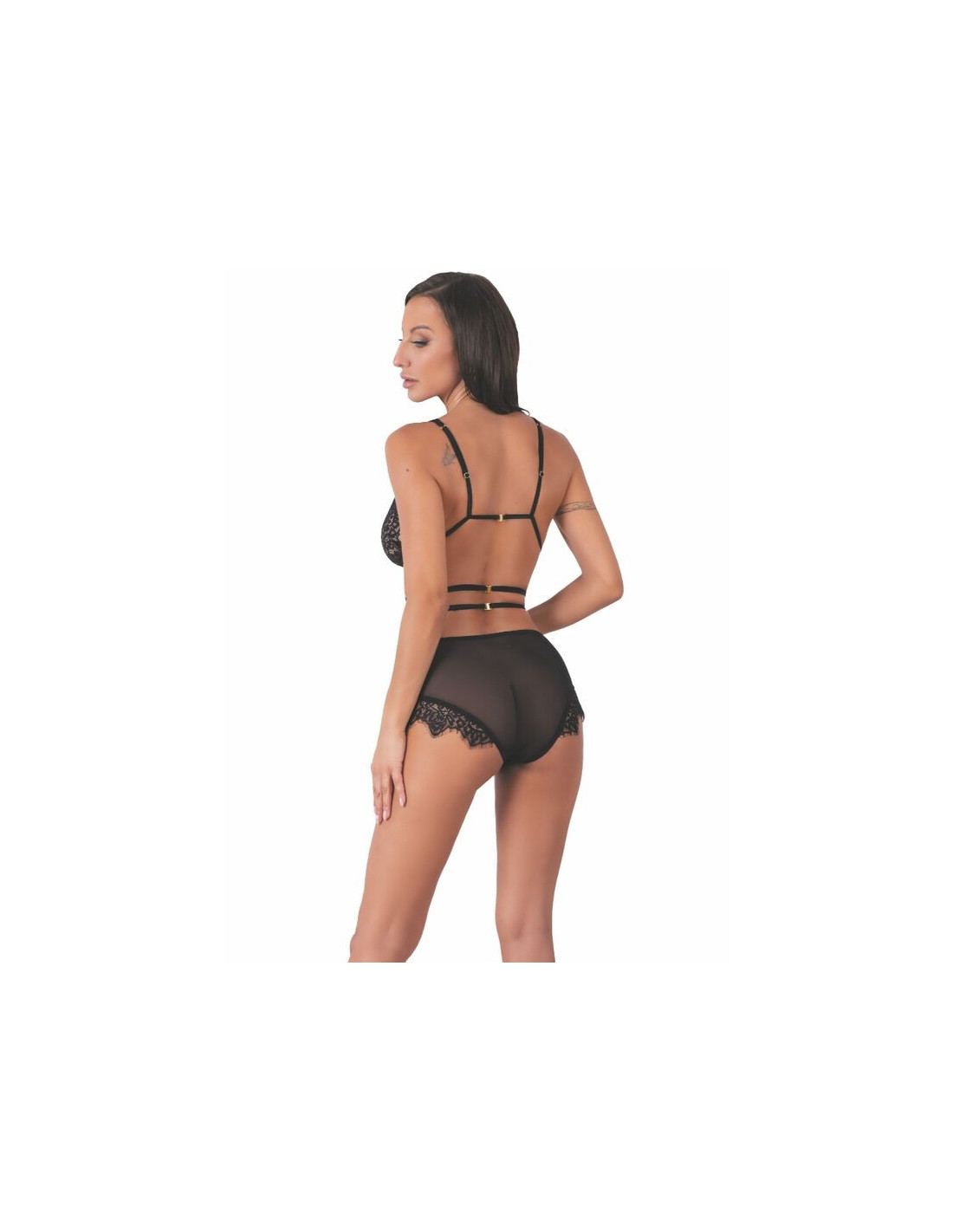 The bra consists of triangular cups with thin, decorative straps. In addition to the standard straps, there are additional straps running through the neckline, emphasizing the bust and making the set look like a unified whole. The panties also have black straps with gold buckles as a fastening. They intersect around the waist, optically slimming the body and giving it sexy, hourglass-shaped proportions. The charming wings on the sides of the panties make the hips appear fuller. The lace bottom of the underwear covers the entire bottom, so it can also be worn every day and under any type of outfit.