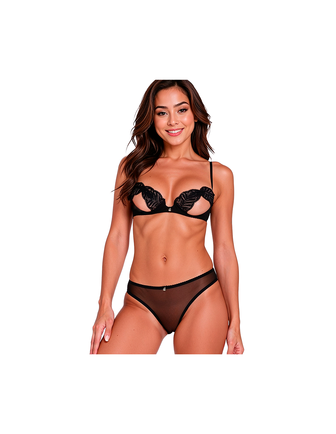 PASSION WOMAN SETSThe INTIMARI set is a modern interpretation of women's lingerie in a luxurious edition. The open-structure bra is crafted from delicate lace with an intricate leaf motif that enhances the bust and gives the design a distinctive character. The thin adjustable straps ensure comfort and a perfect fit, while a subtle jewel-inspired detail between the cups adds an elegant finishing touch.