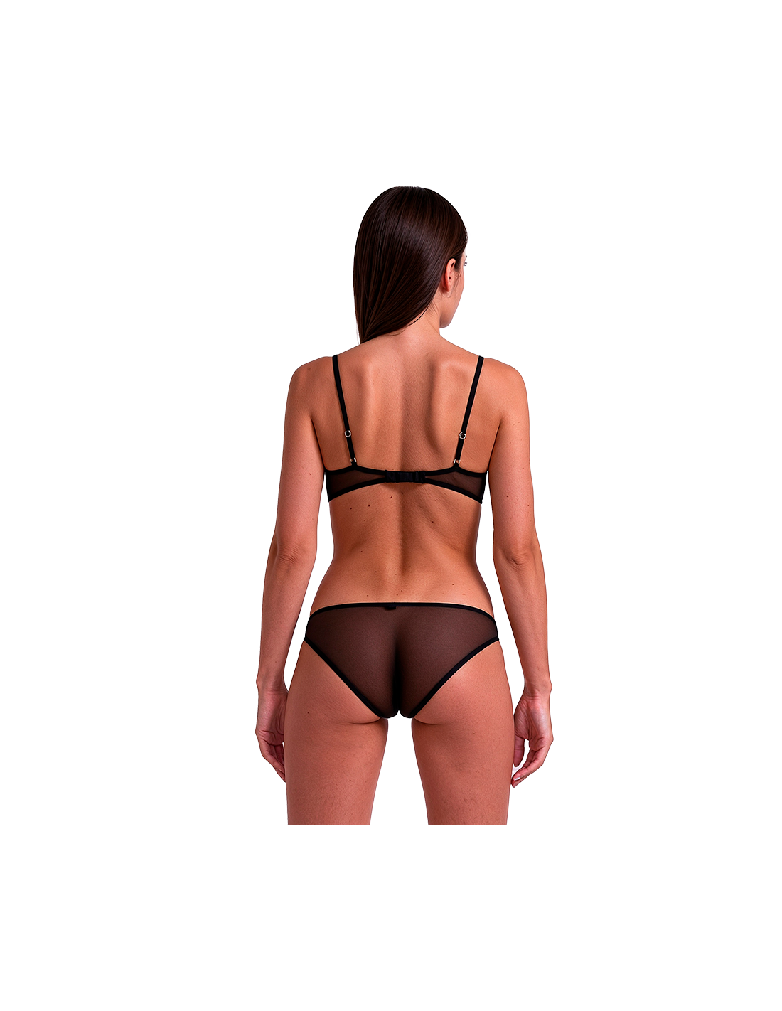 The matching panty is crafted from lightweight, sheer mesh with a fine trim. Its minimalist cut, complemented by a small decorative detail at the waistband, creates a cohesive and elegant set with the bra.