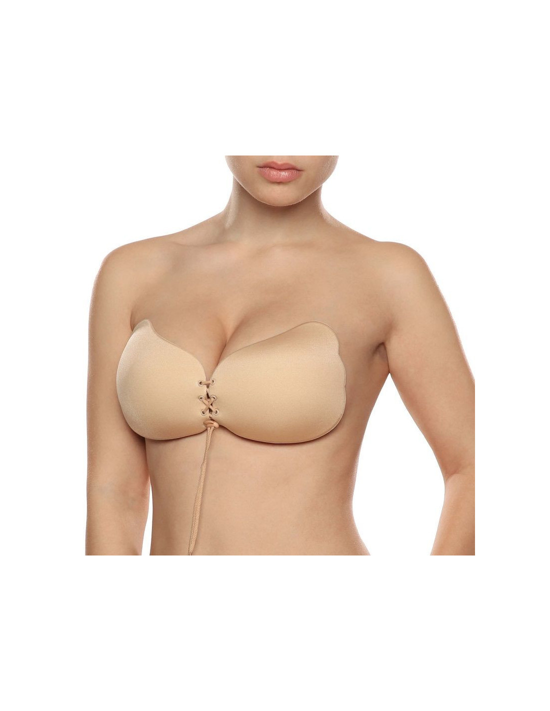 The Lace Bra provides enhanced cleavage and optimal strapless support. Seamless and invisible under clothing, the bra is designed to lift and shape your breasts. The adhesive cups are easy to apply, and the moveable front tie clasp allows the positioning to be adjusted. The tighter the clasp, the more cleavage effect there is.