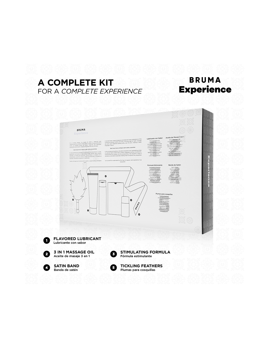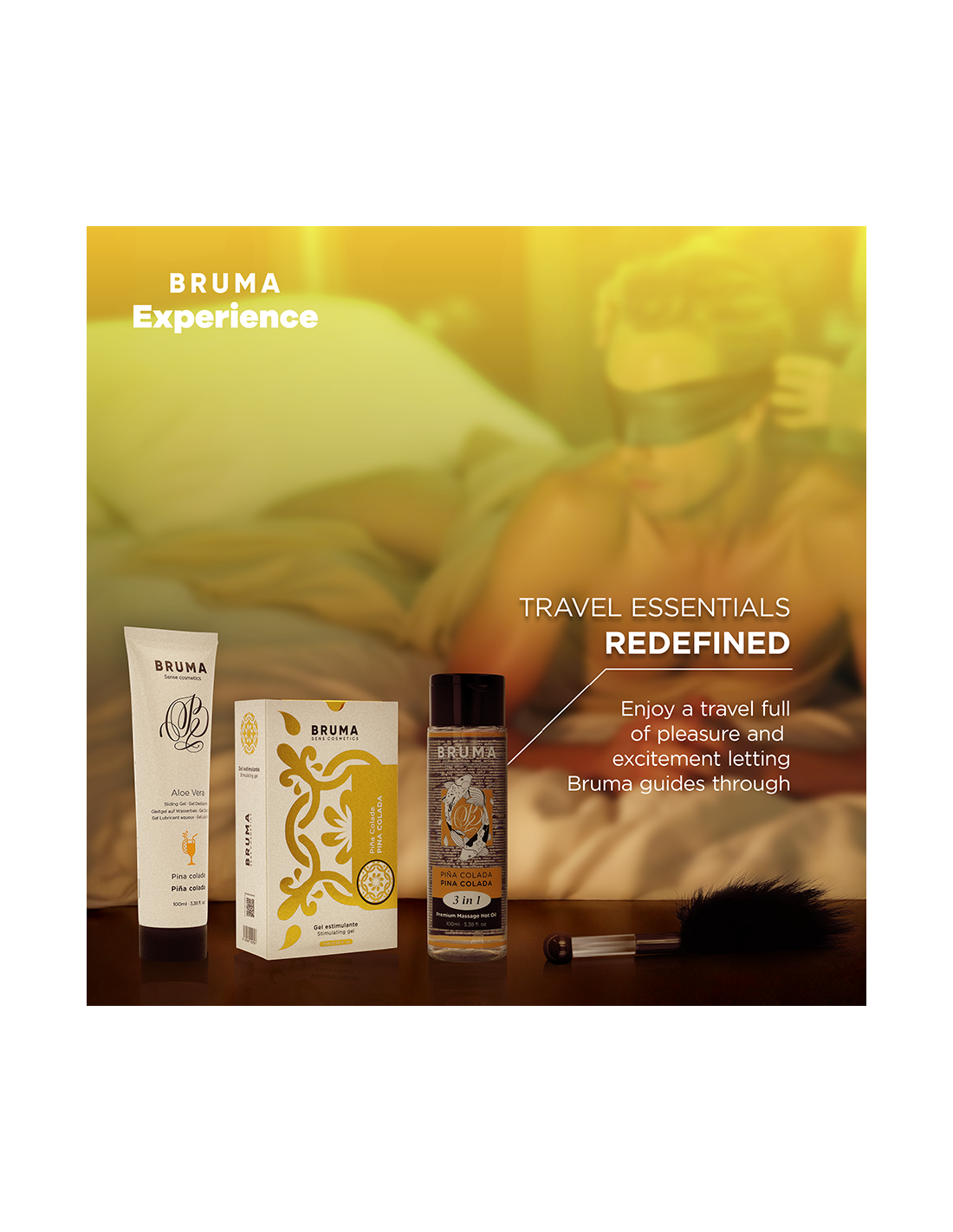 A tropical escape without leaving home. Juicy pineapple and creamy coconut awaken your skin while the stimulating gel warms the air. Accompany the journey with an exotic lubricant, an oil that leaves skin as soft as the sunset, a feather for leisurely exploration, and a blindfold to intensify every sensation. An experience to share with all five senses.