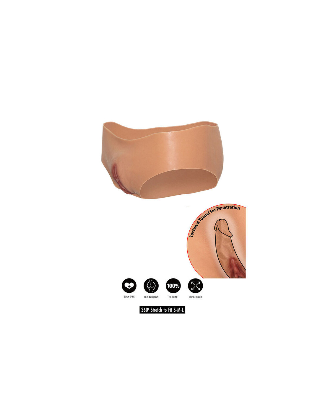 Through the open vagina there is the option of deep penetration into the textured tunnel. Inside the panty there is a soft tube to house the penis. This tube ends in a unique opening for urination at the top of the vagina. Made from 100% pure silicone and featuring a very realistic and very fuckable vagina, the Open Vagina Panty guarantees an exciting experience and hours of passion.