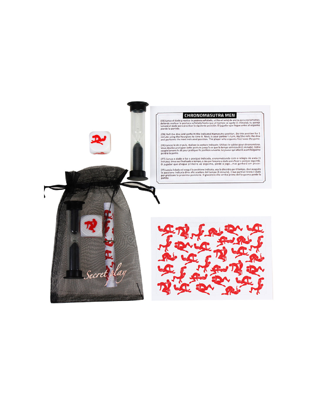 Throw the dice and perform the indicated posture, use the hourglass to time, you must perform the indicated posture until time runs out (1 minute), your partner will roll the dice to practice the next position.