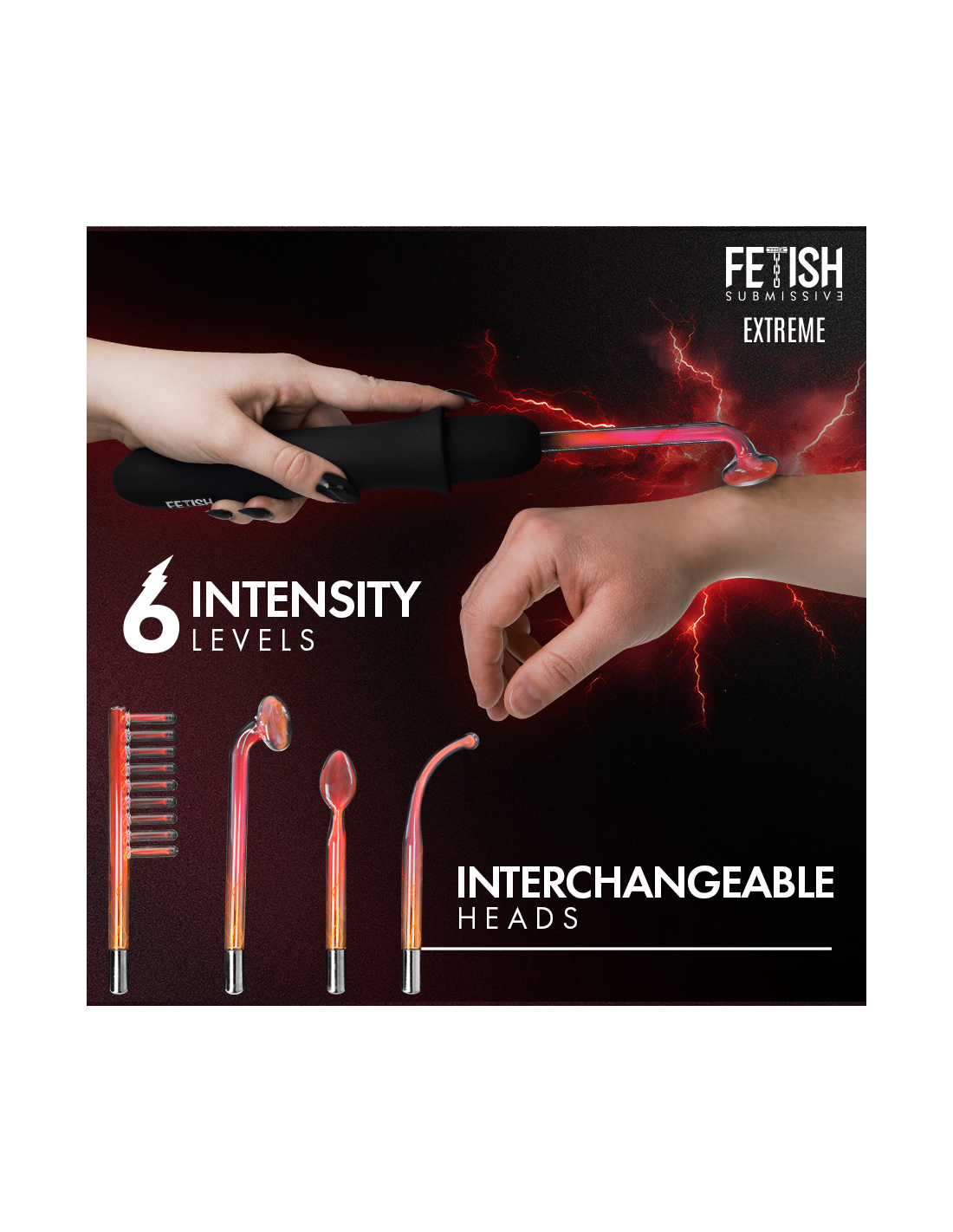 FETISH SUBMISSIVE EXTREMEDare to experience pleasure in its most intense form with the Fetish Submissive Electro-Stimulating Wand Vibrator, a toy designed for those who want to take arousal and submission to a whole new level. Its innovative high-frequency electro-stimulation technology awakens the most sensitive nerves, causing a tingling, contraction, and pleasurable sensation that spreads throughout the body. With 6 adjustable intensity levels, this wand allows you to precisely control the power of each electrical discharge, adapting it to your sensitivity level or the type of play you wish to explore. From gentle pulses to electrifying vibrations, each level offers a unique experience that deeply stimulates the senses and ignites desire. Made with super-soft silicone and body-safe materials, this device guarantees a pleasurable and comfortable experience. Its elegant design includes crystal pieces that add a touch of luxury and sophistication, ideal for lovers of fetish style and domination/submission play. The Fetish Submissive Electro-Stimulating Wand Vibrator includes four interchangeable heads, each designed to offer different sensations and points of contact. Change its texture and shape to explore new ways to stimulate your body and discover your most pleasurable limits.