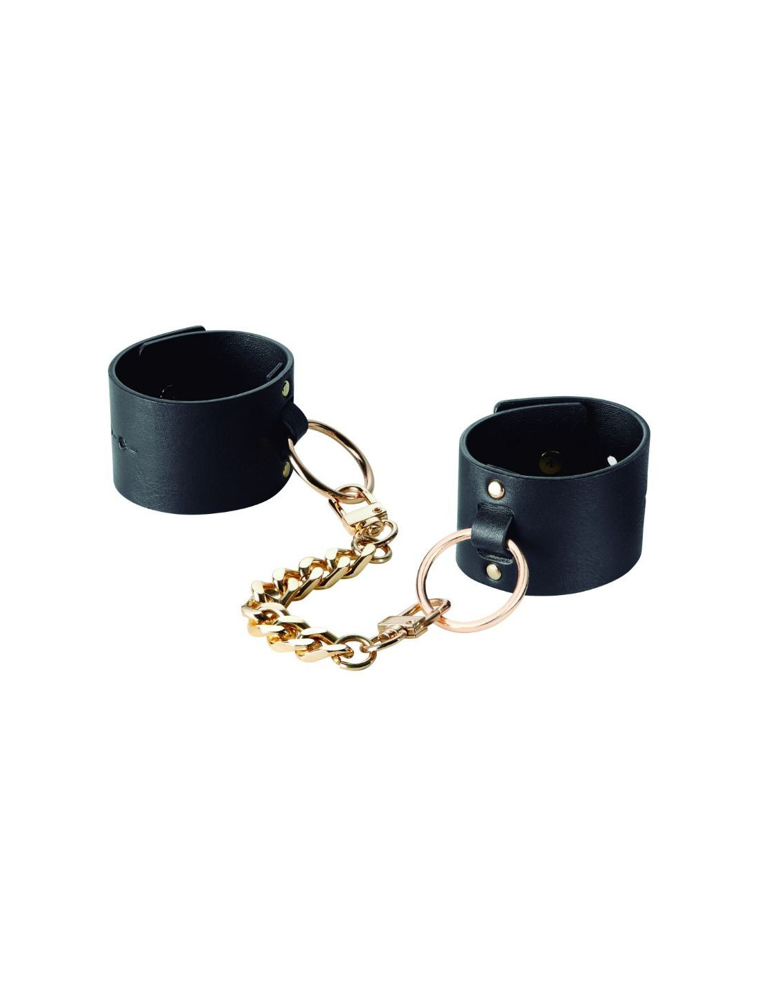 Adjust the vegan leather straps to your wrists to and wear them as bracelets. Attach the chain to the buckles on the bracelets and turn them into your favourite handcuffs.