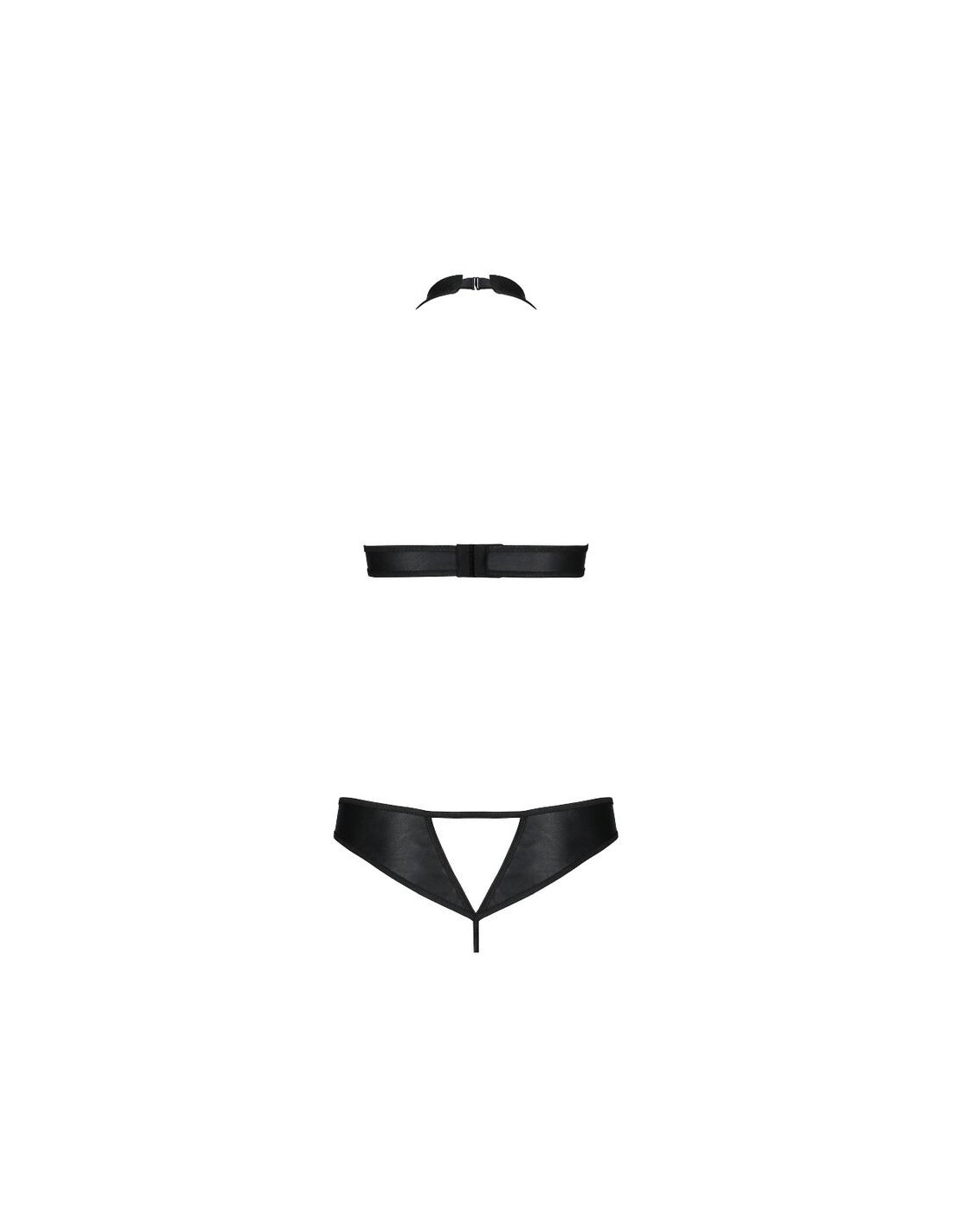 Malwia is a set consisting of a leather top attached to the neck with decorative rings and laces, which emphasizes and enhances the bust and the thong with a charming cutout. The decorative joints in the shape of circles give a peculiar charm.
