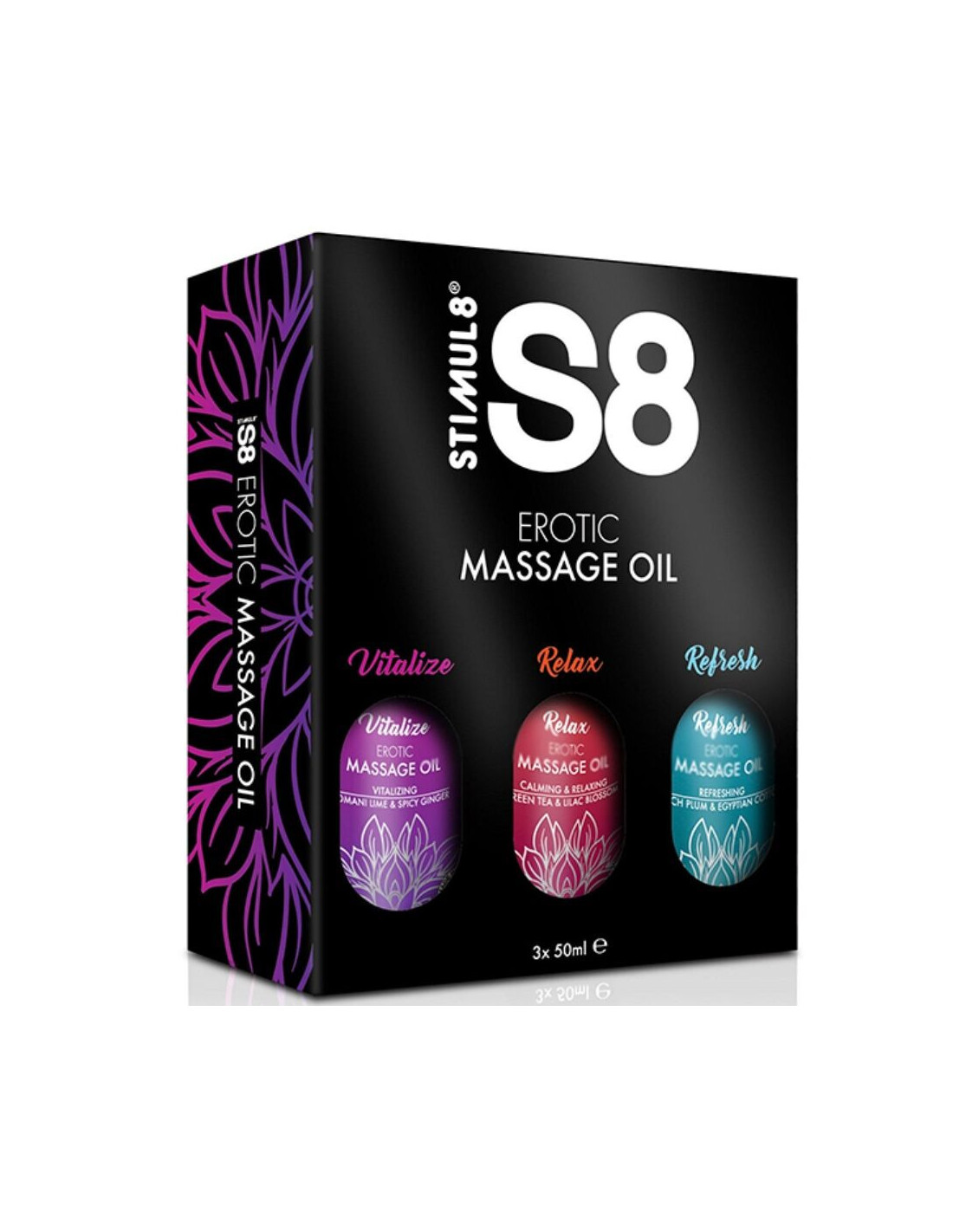 These rich S8 massage oils are a unique blend of 3 powerful oils: jojoba oil that soothes and strengthens the skin, almond oil for moisturizing and care and sesame oil which is highly nourishing and lubricating. This S8 oil is enriched with essential vitamins and minerals. After a good massage your skin will feel silky smooth and relaxed. This box includes 3 different scents: Omani Lime & Spicy Ginger, Green Tea & Lilac Blossom and French Plum & Egyptian Cotton.