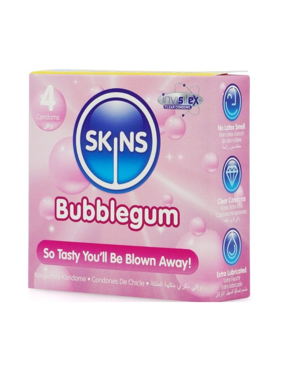 4-Pack of Skins Bubblegum Blow Me! Condoms Give them a touch of excitement with the tempting fruity bubblegum scent. The high-quality latex is infused with the scent of bubblegum, for a long-lasting, delicious aroma that adds a whole new sensation to sex. Skins condoms are stronger, thinner, and more lubricated than most. This means they feel like a second skin and are less likely to break. Skins are not only the best for sensation and pleasure, but also one of the safest condoms on the market.