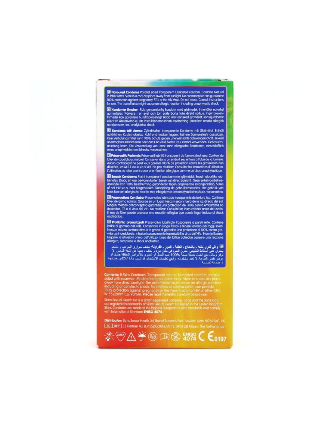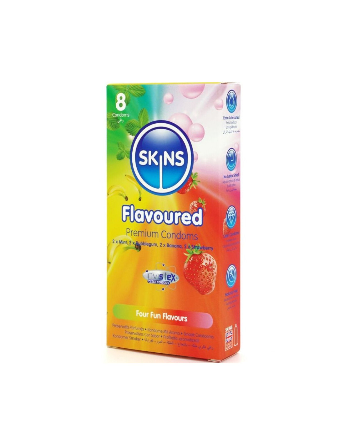 Introducing the Skins Flavor 8-pack: a stylish, ready-to-use solution that offers up to 33% more condoms per pack than the market leader. This exciting multipack includes four enticing flavors: Banana, Bubblegum, Mint, and Strawberry, giving consumers a fun and tasty way to enhance intimacy for any occasion. Each condom is individually wrapped and made with premium natural latex, providing a natural feel, transparency, and strength. Enriched with extra lubrication and delicious fragrances, these condoms eliminate the typical latex odor to ensure a more pleasurable experience.