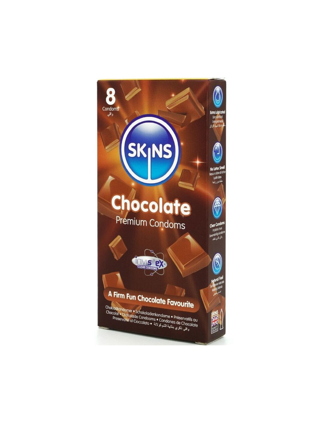 Introducing our new chocolate flavor 8-pack, featuring a sleek, ready-to-use design and up to 33% more condoms than the market leader. Appeal to those looking for a fun, high-quality intimate product with Skins chocolate flavor condoms. These individually wrapped condoms combine pleasurable taste with superior protection, making them the ideal choice for adult product stores, pharmacies, and wellness retailers. These Skins condoms are a great way to combine two loves: sex and chocolate. Theyre lubricated and have a delicious chocolate aroma thats truly tempting, and they taste like chocolate too. Like all Skins condoms, theyre made from high-quality, dermatologically tested latex, giving you the protection you need.