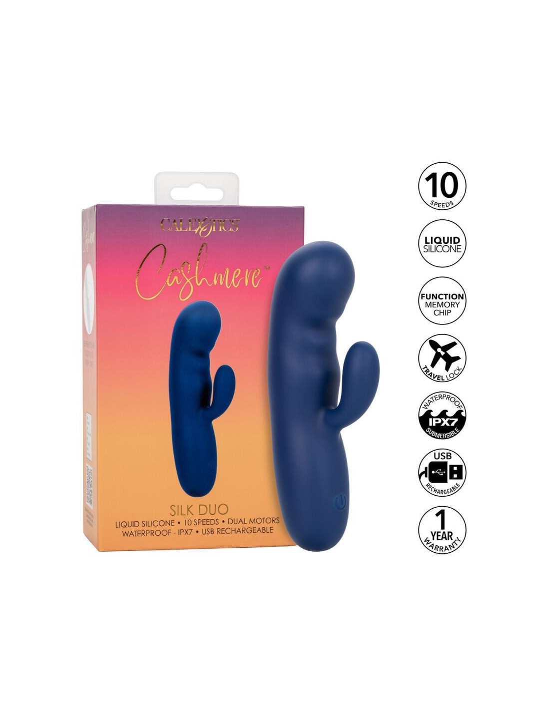 Indulge in pure luxury with the Cashmere Silk Duo, a dual-motor massager designed for your deepest desires. Its curved tip targets the G-spot, while the flexible, malleable design ensures a comfortable fit. Explore 10 vibration speeds for personalized pleasure, made with premium liquid silicone for a velvety texture. Waterproof with an IPX7 rating, it's perfect in and out of the water. The memory chip remembers your favorite mode, and the travel lock ensures worry-free transportation. USB rechargeable with a 2-hour charge time, enjoy up to 55 minutes of stimulation at high speed or 80 minutes at low speed. Elevate your pleasure with Cashmere Silk Duo.