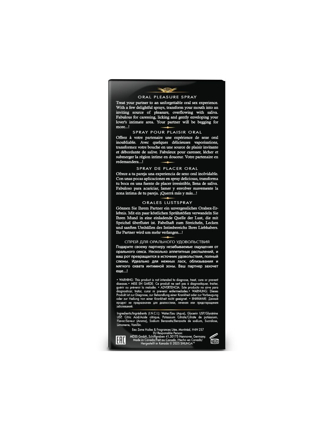 SHUNGA APHRODISIACSDiscover a new way to enjoy oral sex with this spray designed to elevate the experience to another level. With just a few sprays, your mouth acquires a softer, wetter texture, perfect for sensually exploring every intimate corner of your partner. Its delicious flavors awaken the senses and transform every kiss, every lick, and every touch into an irresistible stimulus that naturally increases desire.
