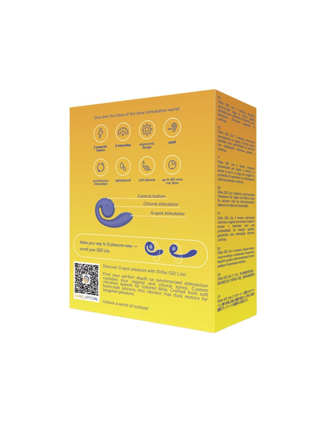 The SVibe GIZI Lite is designed to explore and enhance G-spot pleasure through perfectly synchronized dual stimulation. Its shape allows you to find the ideal depth while vibrations caress both vaginal and clitoral areas at the same time, creating a balanced, immersive, and deeply satisfying experience.
