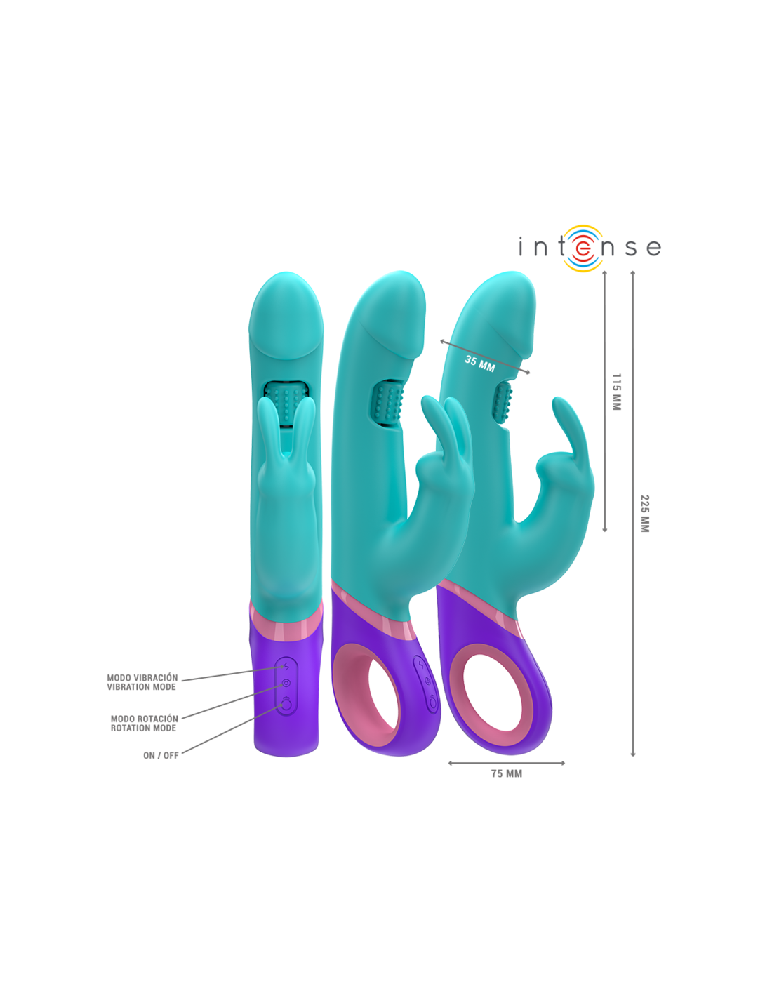 INTENSE HIGH TECHThe MONICA vibrator from the INTENSE brand is an elegant rabbit vibrator in an attractive blue color, designed to offer a complete sensual experience thanks to its double stimulation and its innovative rotating stimulator for the G-spot.
