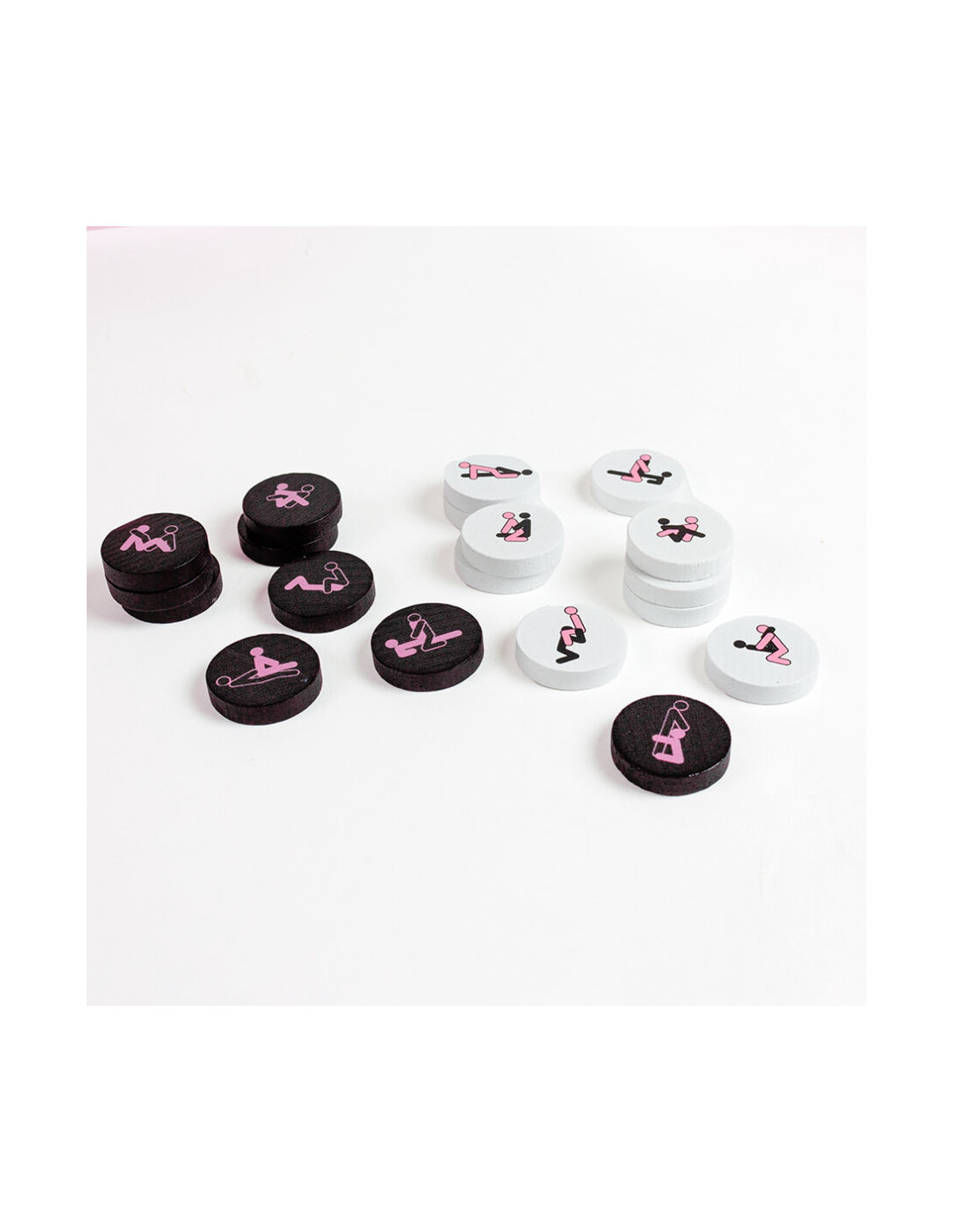 • 42 pieces (21 white pieces and 21 black pieces) each with a different Kama Sutra position.