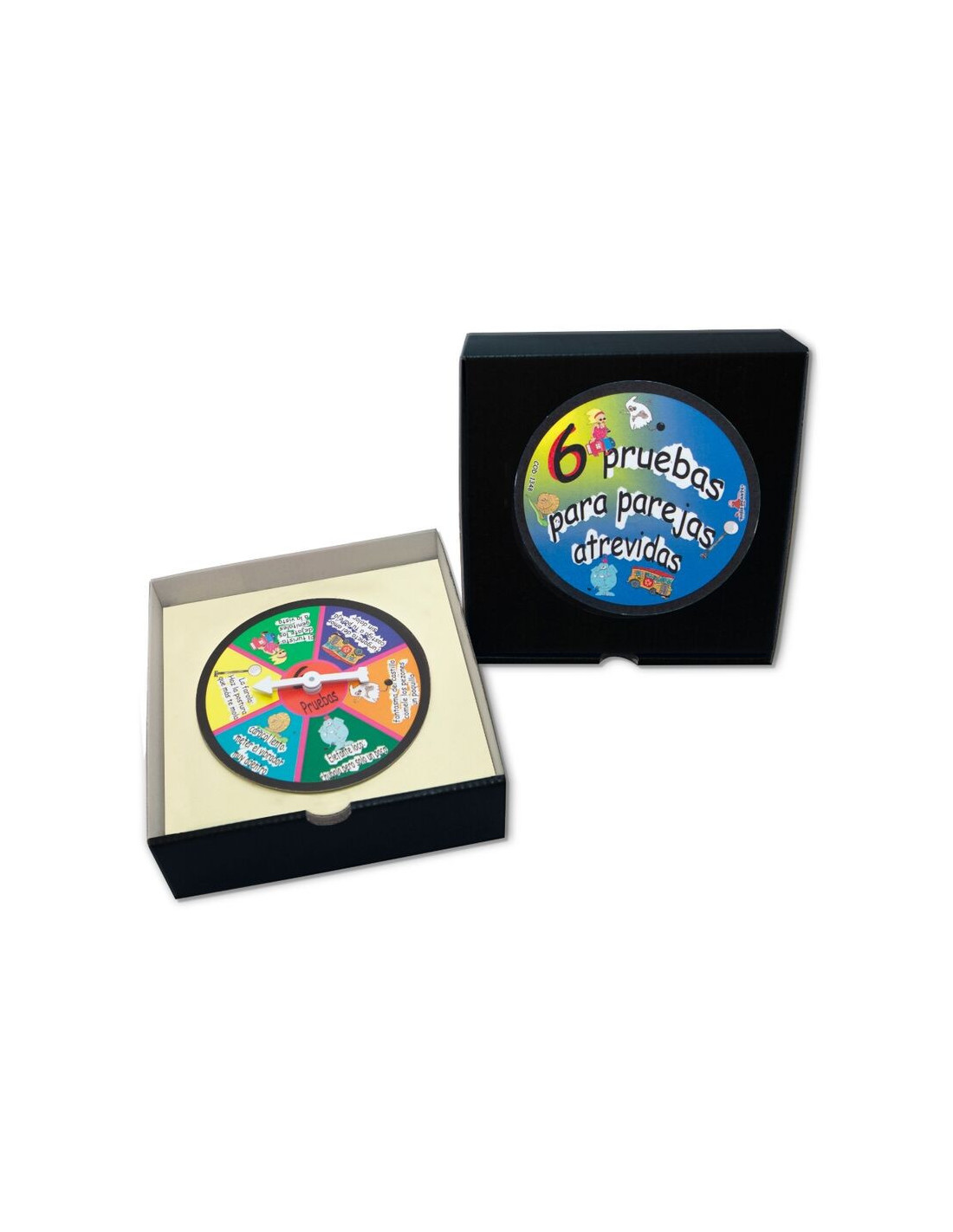 It is a roulette game for daring couples that goes in a VERY FUN CARDBOARD BOX. The game consists of turning the roulette with force and following the instructions that are indicated to have a good time fun.