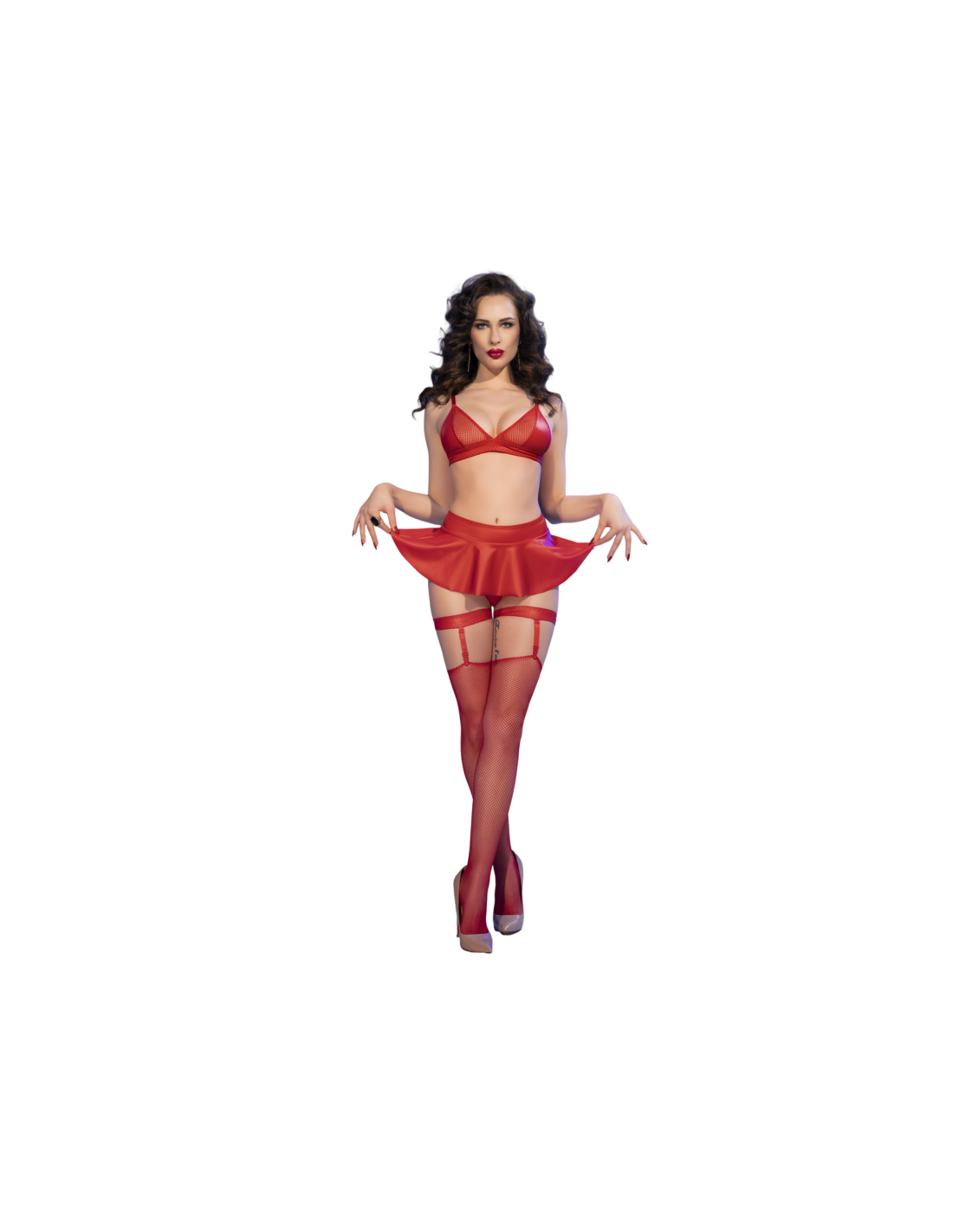 The set is completed with a short, flared skirt that accentuates the waist and adds a playful touch. It also includes matching thong panties, garter straps, and stockings, creating a fully sensual and alluring look. Ideal for special occasions that call for a daring and captivating outfit.
