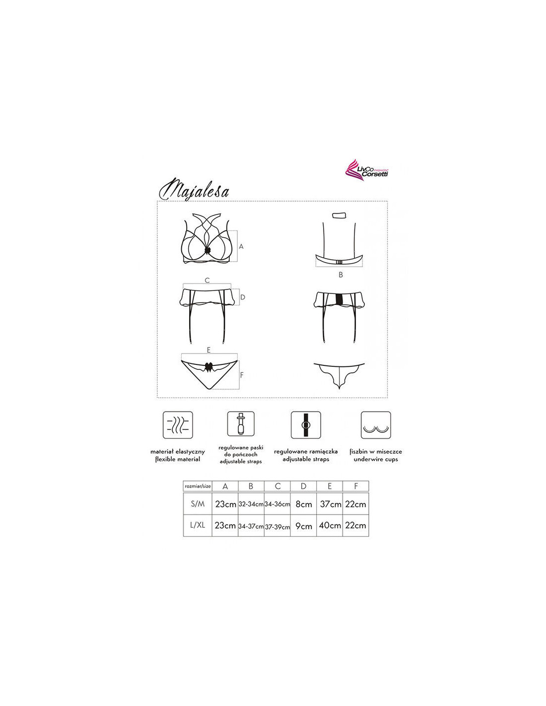 LIVCO CORSETTI SETSThe set consists of a bra, panties and a garter belt that will look great on both slim and slightly curvier figures. The cut of the set perfectly masks minor figure imperfections around the hips and belly. The bra delights with unusual straps and sensual lace, and thanks to the underwires, it effectively lifts the breasts and shapes them beautifully. In turn, the panties give a perfect shape to women's hips and ignite the senses thanks to subtle cutouts. The set is made of soft and flexible lace. The material is pleasant to the touch, stretchy and adheres well to the body. The lace does not scratch or restrict movements, allowing you to maintain complete freedom and comfort. The black material looks good on any skin tone and is completely universal, suitable for any occasion.