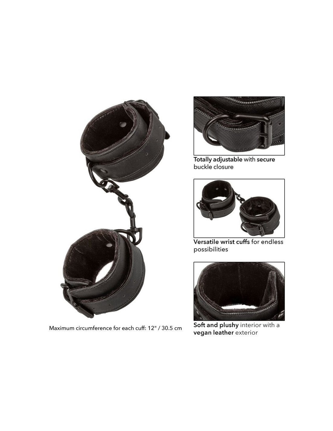 - Totally adjustable wrist cuffs with secure buckle closures | Universal clasps and D-rings with swivel design for full dexterity | Soft and plushy interior with a vegan leather exterior | Double padded, double stitched | Functional, durable and textured design