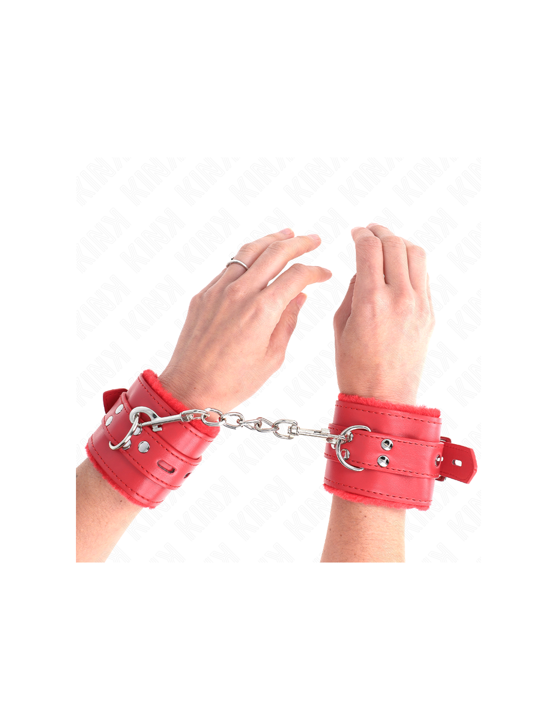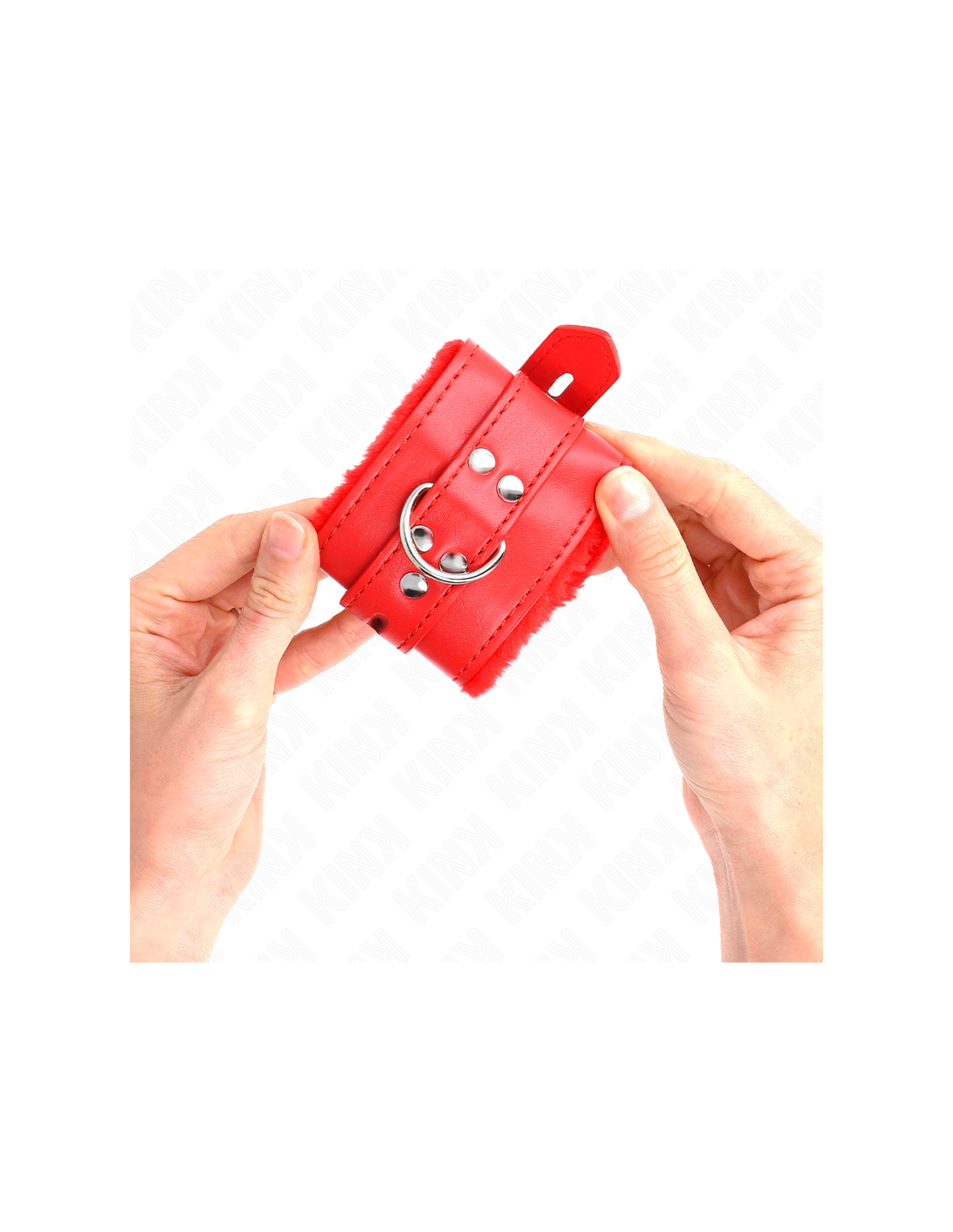KINK - FUR LINED WRIST RESTRAINTS WITH SQUARE HOLES RED AND RED BELT ADJUSTABLE 17-29 CM X 6 CM