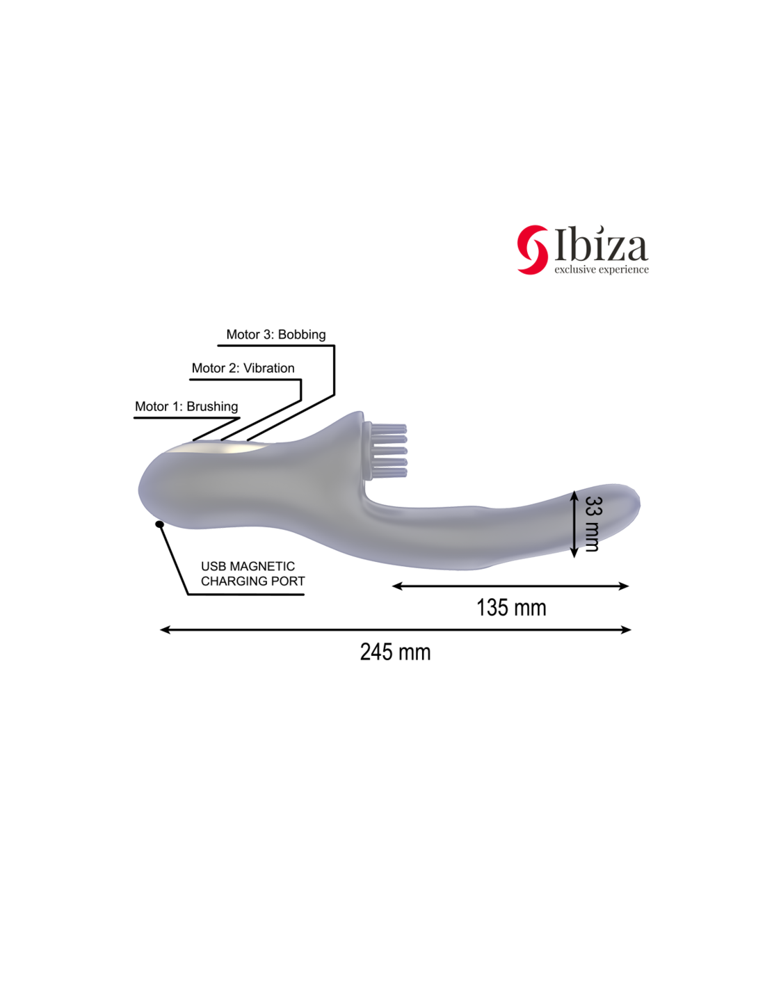 Equipped with three powerful motors, the IBIZA offers unrivaled performance, designed to stimulate multiple areas with precision. Its 10 vibration modes, 6 rocking modes, and 7 brushing modes allow you to customize every moment, adapting to your preferences and taking your experience to the next level.
