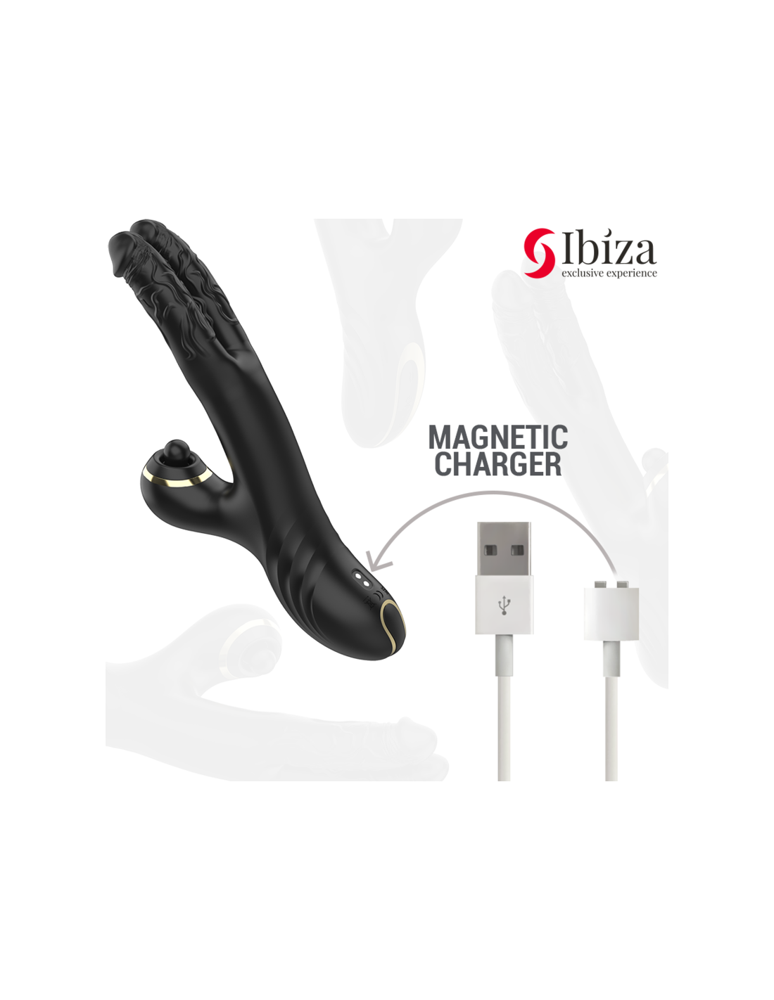 The TWO DRAGONS vibrator from IBIZA is a dual stimulation device designed for those looking to explore new sensations and elevate their intimate experiences. With its elegant black color and innovative design, TWO DRAGONS offers a perfect combination of internal and external pleasure for complete stimulation.