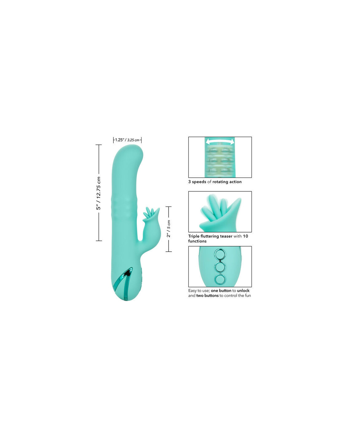 - Powerful rotating and vibrating massager plus triple flutter teaser