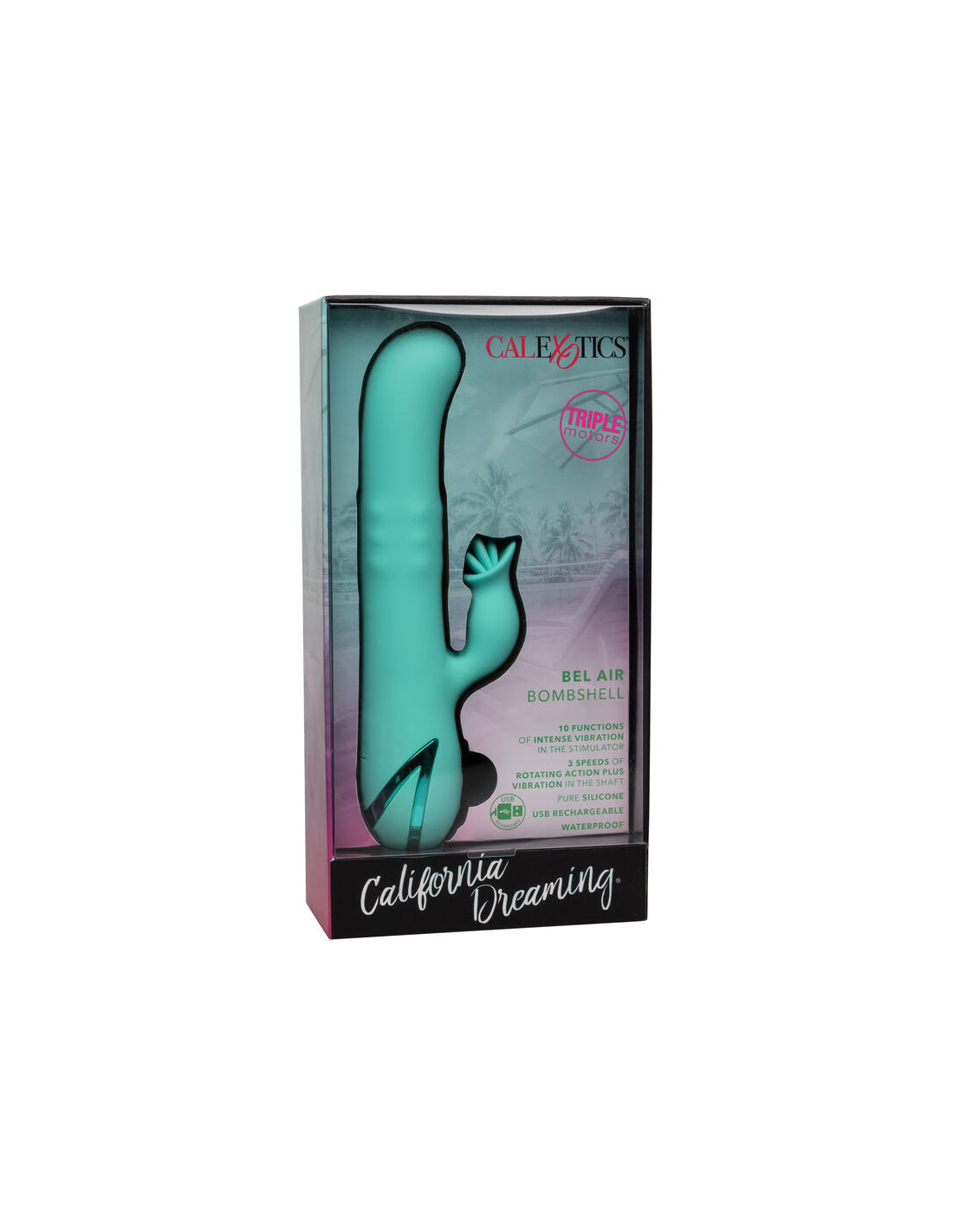 Dive into pools of pleasure and sun-kissed fantasies with the stylish California Dreaming Bel Air Bombshell. The luxurious massager has 10 intense vibration functions, 3 independent shaft rotation functions, and a unique triple teaser for a one-of-a-kind pleasure experience.