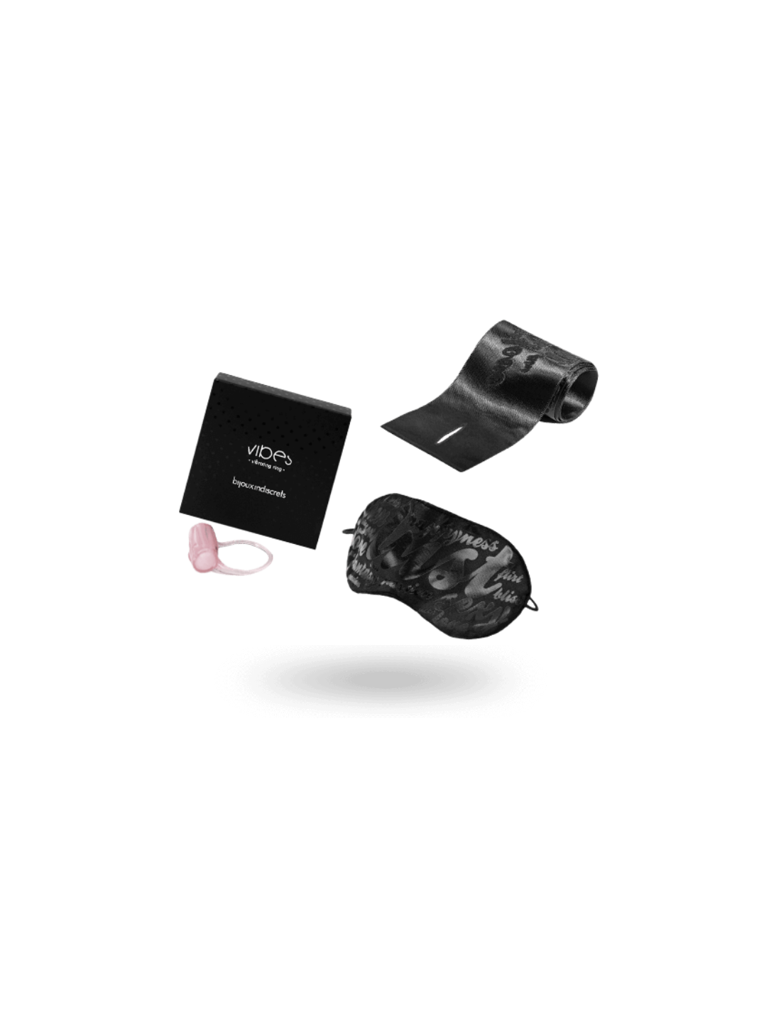 - Contents: Vibrating ring; Satin handcuffs; Satin mask.