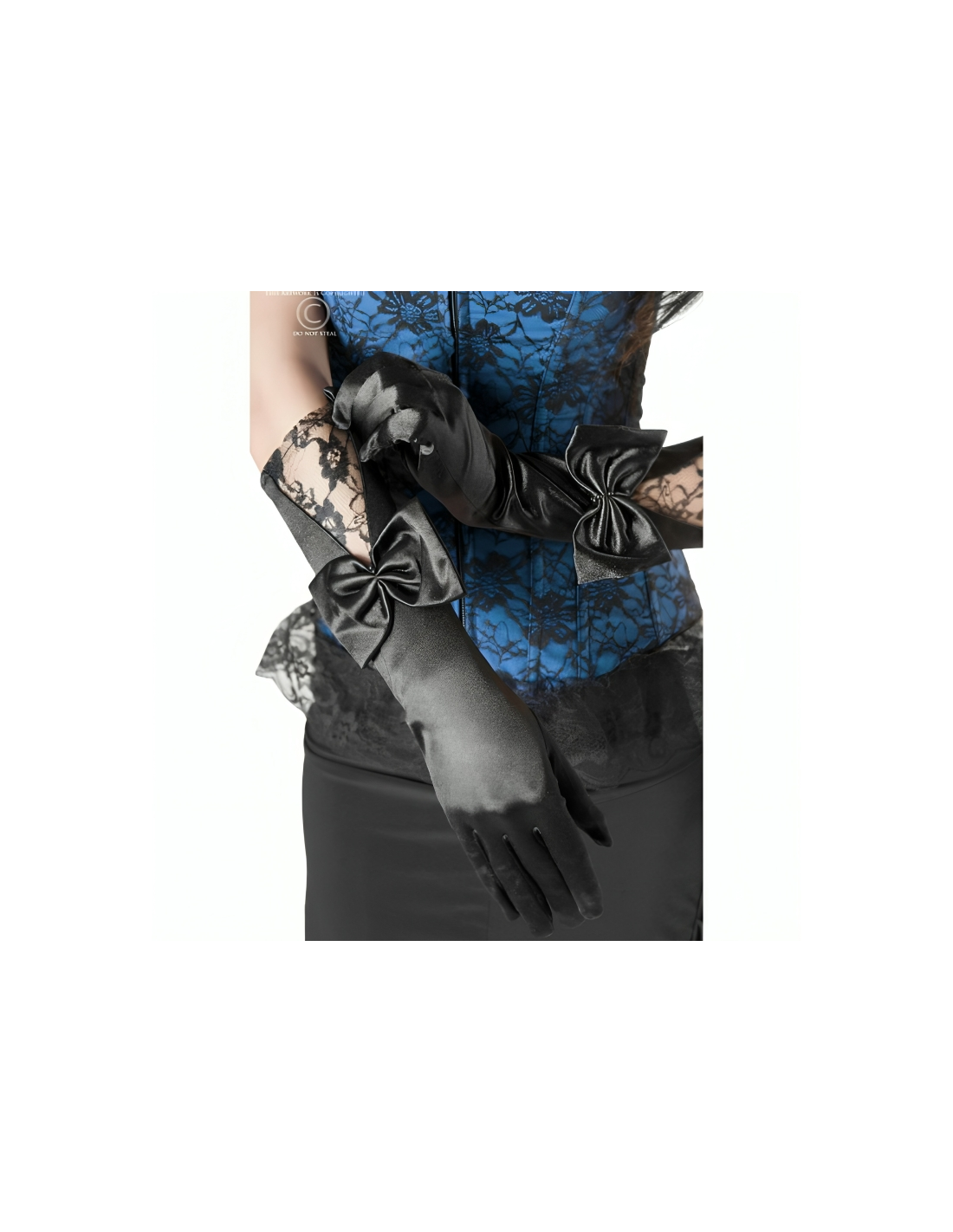 - The gloves are made of black satin fabric and decorated on the top with an intriguing lace and a black bow.